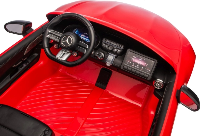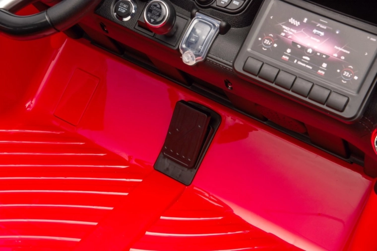 Bezpieczeństwo i kontrolę zapewnia pilot 2,4 GHz z 3 prędkościami i awaryjnym przyciskiem Stop. Dwa oddzielne siedzenia z eko skóry z pasami bezpieczeństwa oferują komfort i pewność. Samochodzik zachwyca także oświetleniem LED z przodu i z tyłu, wskaźnikiem naładowania oraz otwieranymi drzwiami dla łatwego wsiadania.