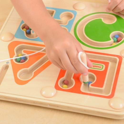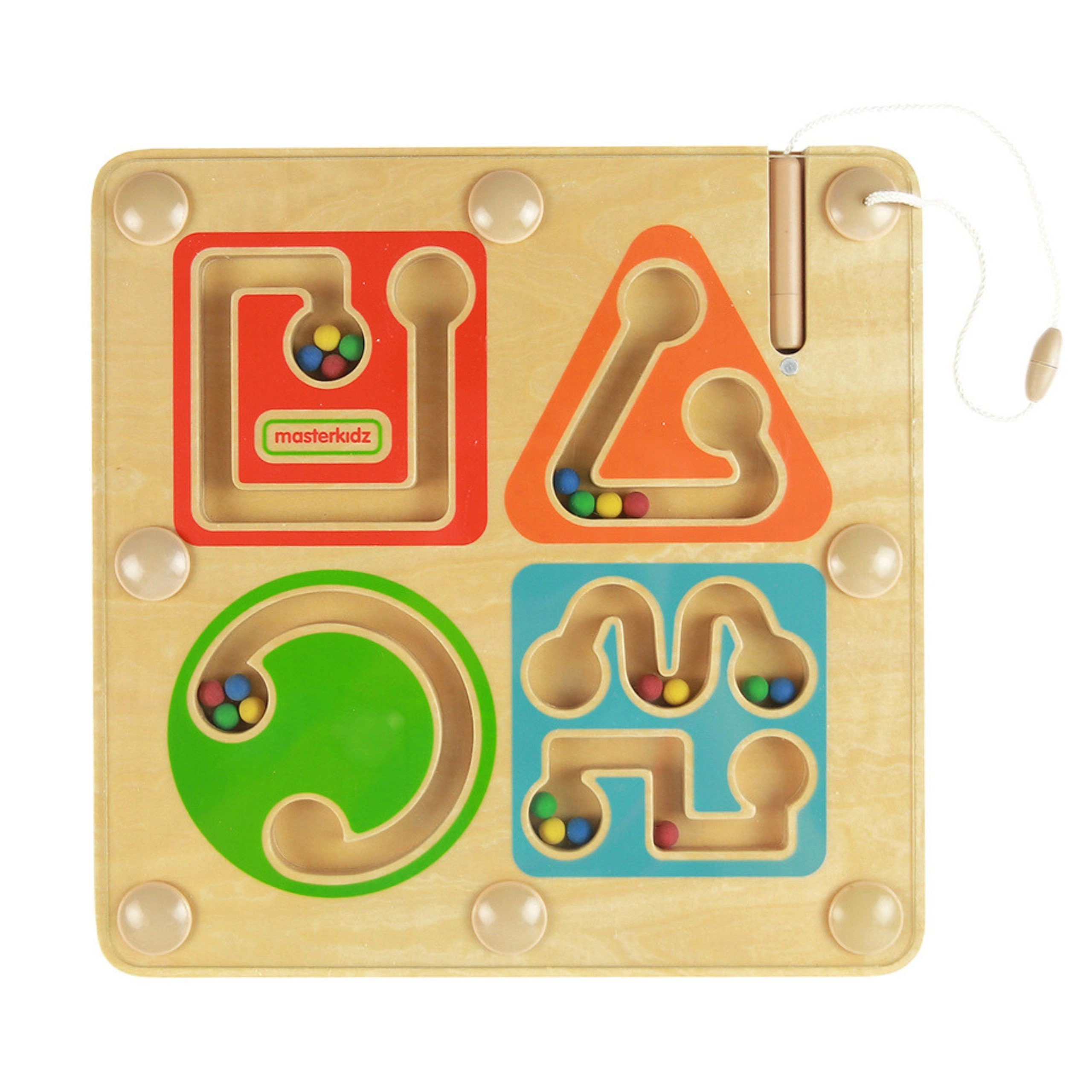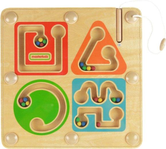 Drewniany magnetyczny labirynt marki MASTErKIDZ zamienia pierwsze kroki w nauce pisania w zabawę. Za pomocą magnetycznego pióra na sznurku dziecko prowadzi kolorowe kuleczki czterema zakręconymi torami, trenując małą motorykę, koordynację ręka–oko oraz koncentrację. Dzięki zamkniętemu systemowi kuleczki pozostają bezpiecznie w środku, a zabawka idealnie sprawdza się w domu i w podróży.