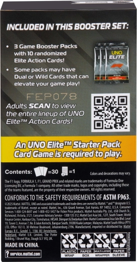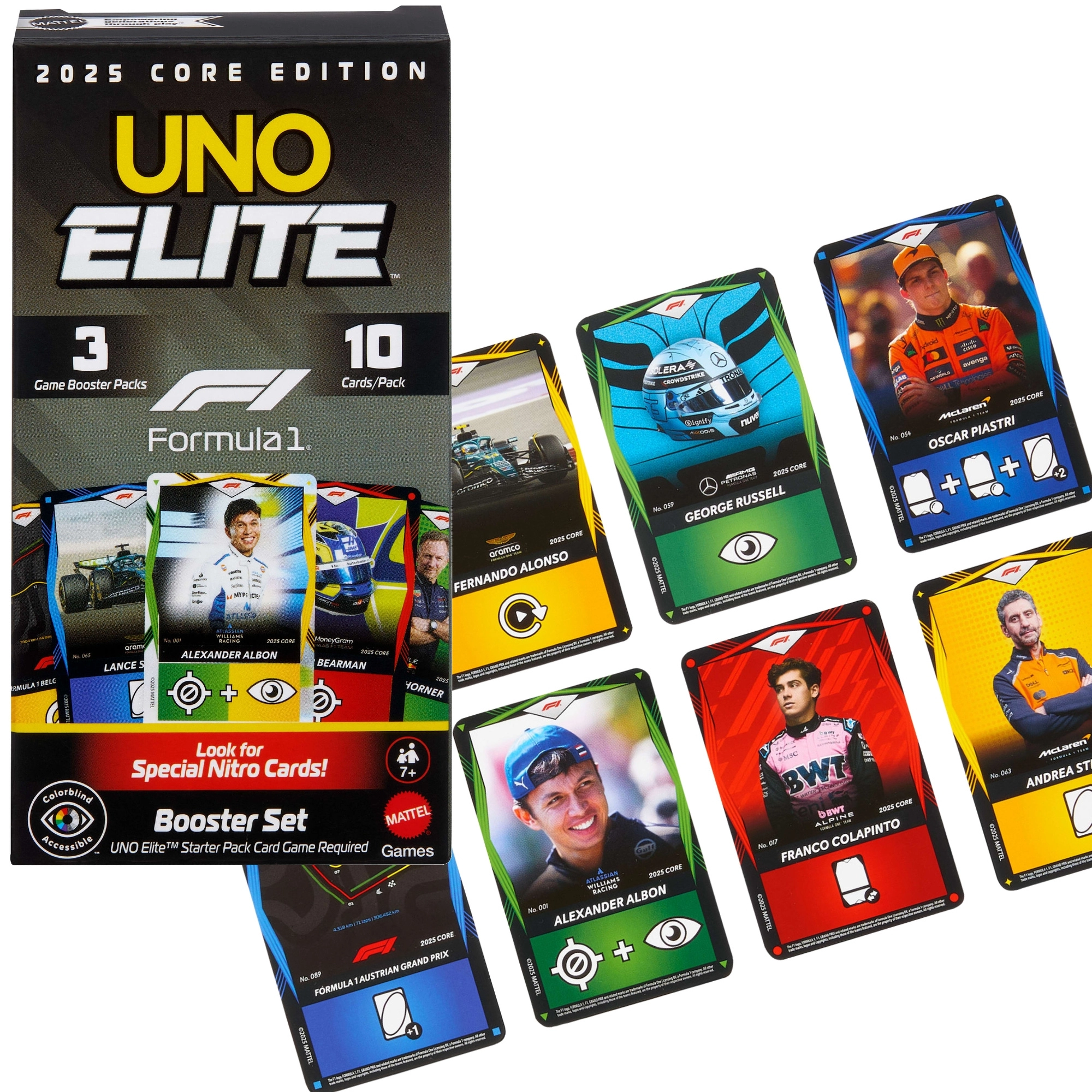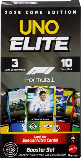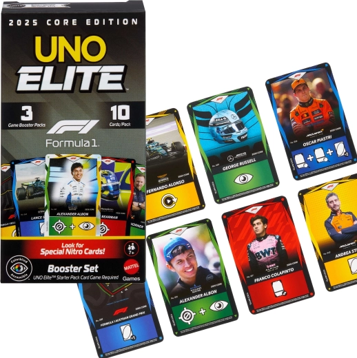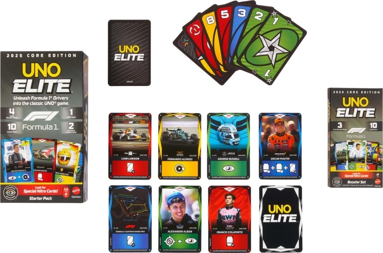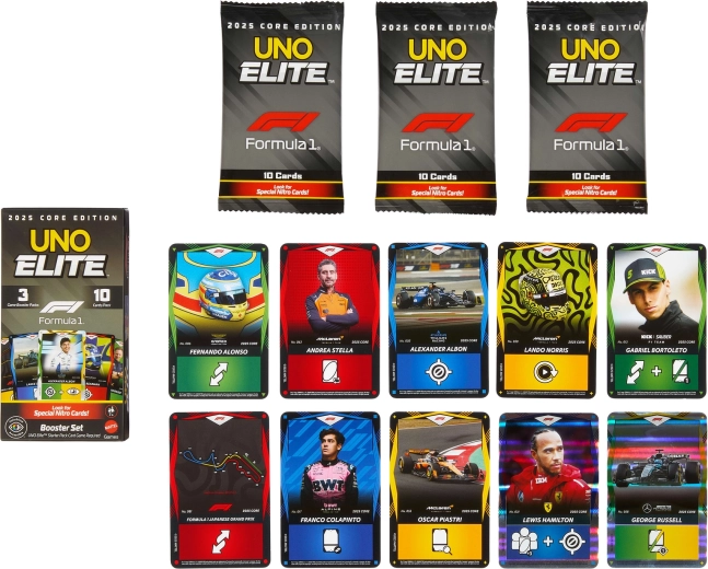 Wejdź w szybkie tempo wyścigów z rozszerzeniem UNO Elite Formula 1 2025. Każdy Booster Pack przynosi losowo wybrane karty z motywami kierowców F1, bolidów, kasków i torów. Specjalne karty Elite aktywują swoje zdolności po wyłożeniu karty z ikoną Elite w tym samym kolorze, dzięki czemu zyskasz nowe strategie i emocjonujące momenty w każdej rozgrywce.