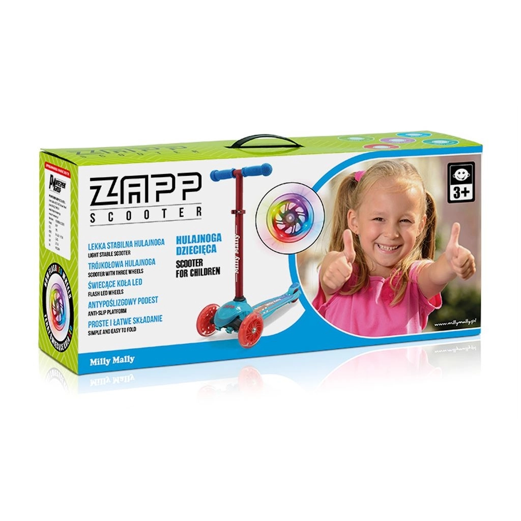 Szukasz pierwszej hulajnogi dla dziecka, która łączy stabilność, bezpieczeństwo i zabawę? Model MILLY MALLY Zapp mint ma dwa duże przednie i jedno tylne koło dla pewności w zakrętach, świecące przednie kółka dla radości z jazdy oraz regulowaną kierownicę, aby hulajnoga rosła razem z dzieckiem.