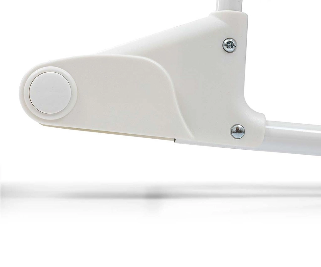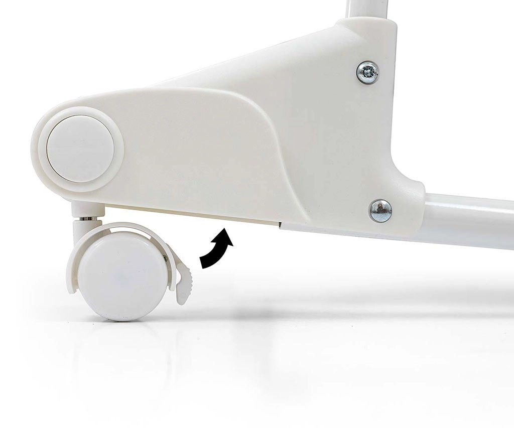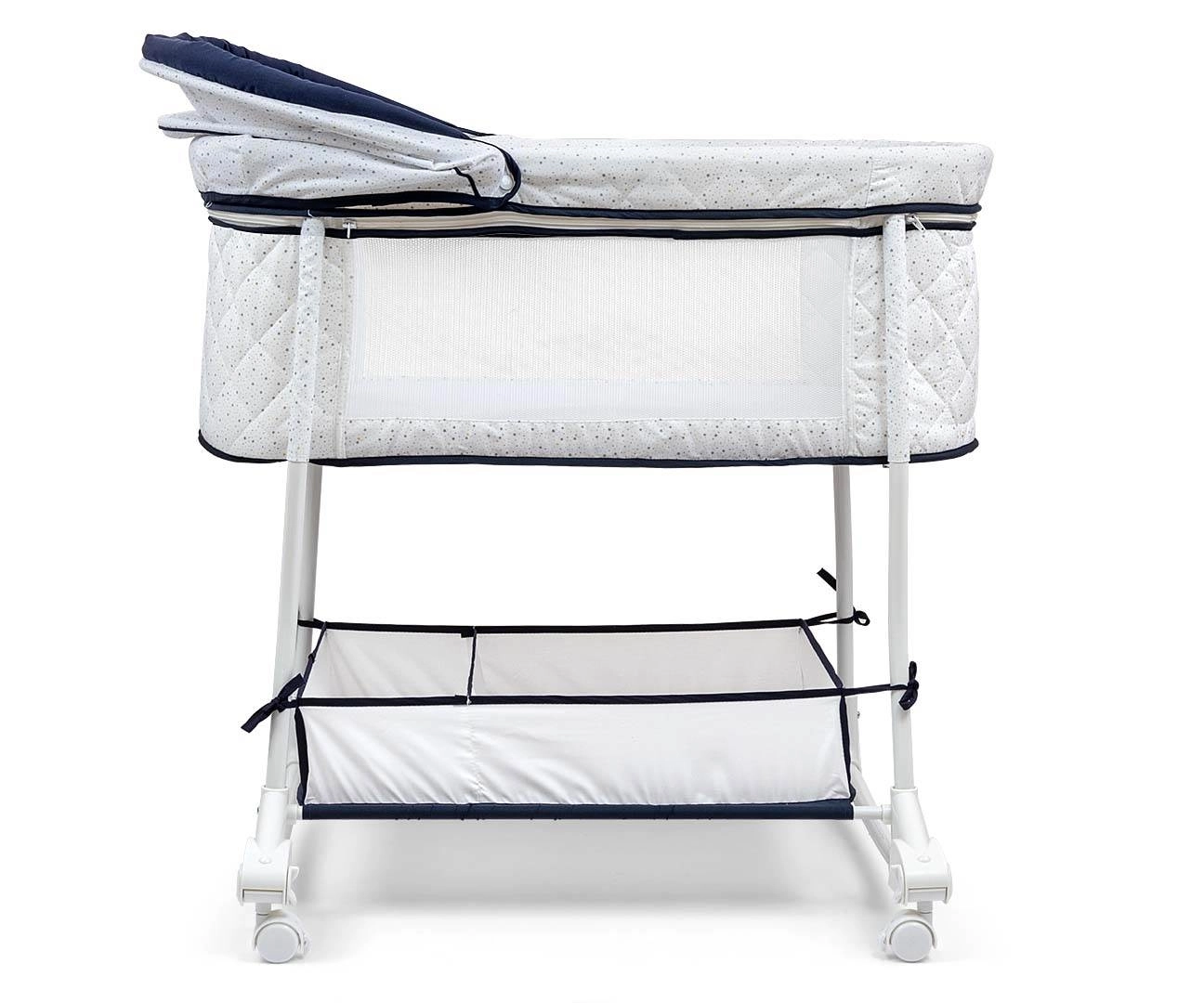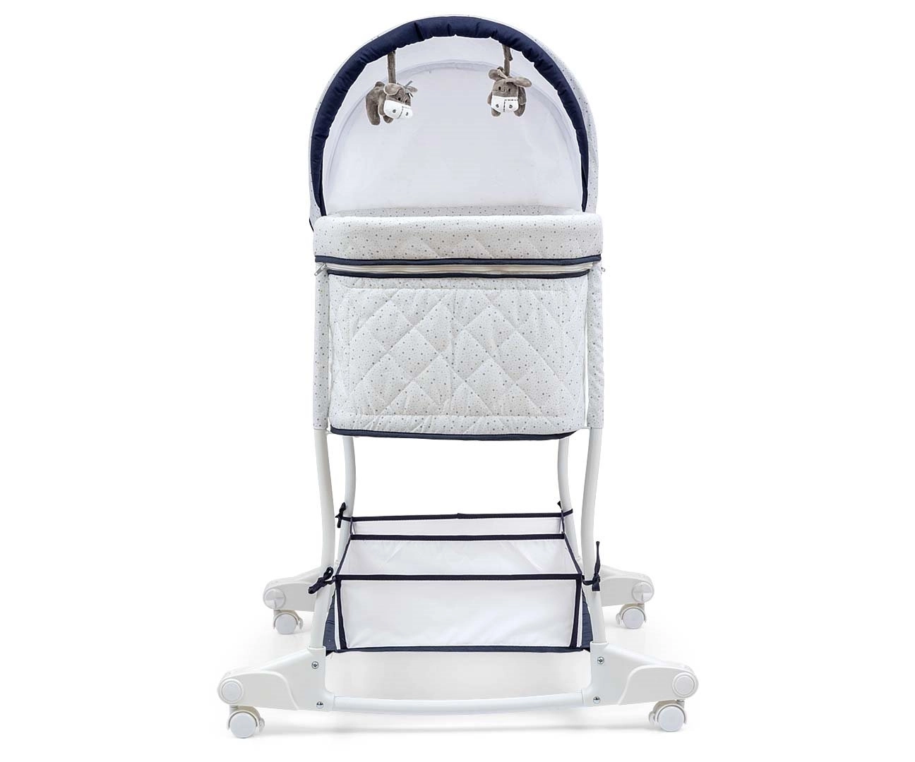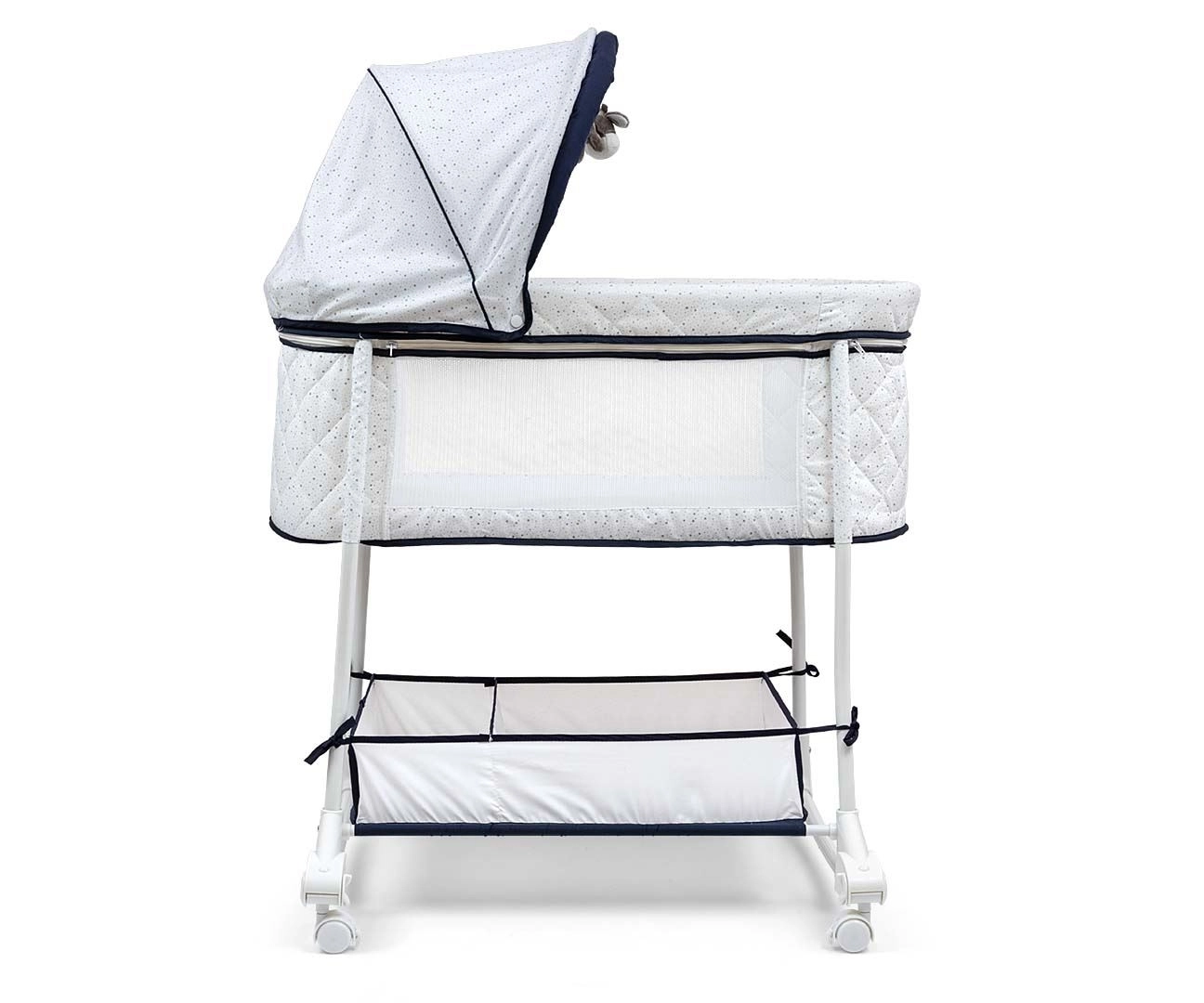 Praktyczny odpinany i składany daszek z dwoma miękkimi pluszowymi zabawkami chroni przed światłem i oferuje stymulację wzrokową. Miękki materac oraz pikowana wewnętrzna wyściółka zapewniają maksymalny komfort, natomiast dolny kosz z dwiema przegrodami pomieści wszystkie niezbędniki. Metalowa rama, blokowane kółka oraz antypoślizgowe nóżki zapewniają stabilność, a jednocześnie ułatwiają przemieszczanie po domu.