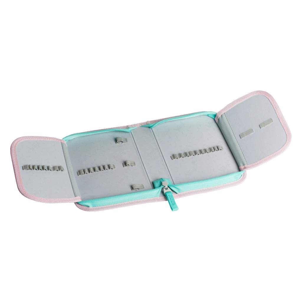 Odchylane otwieranie umożliwia łatwe wyjmowanie przyborów wprost z ławki, wewnętrzny organizer z gumką oraz przezroczysta kieszeń na plan lekcji pomagają utrzymać porządek.