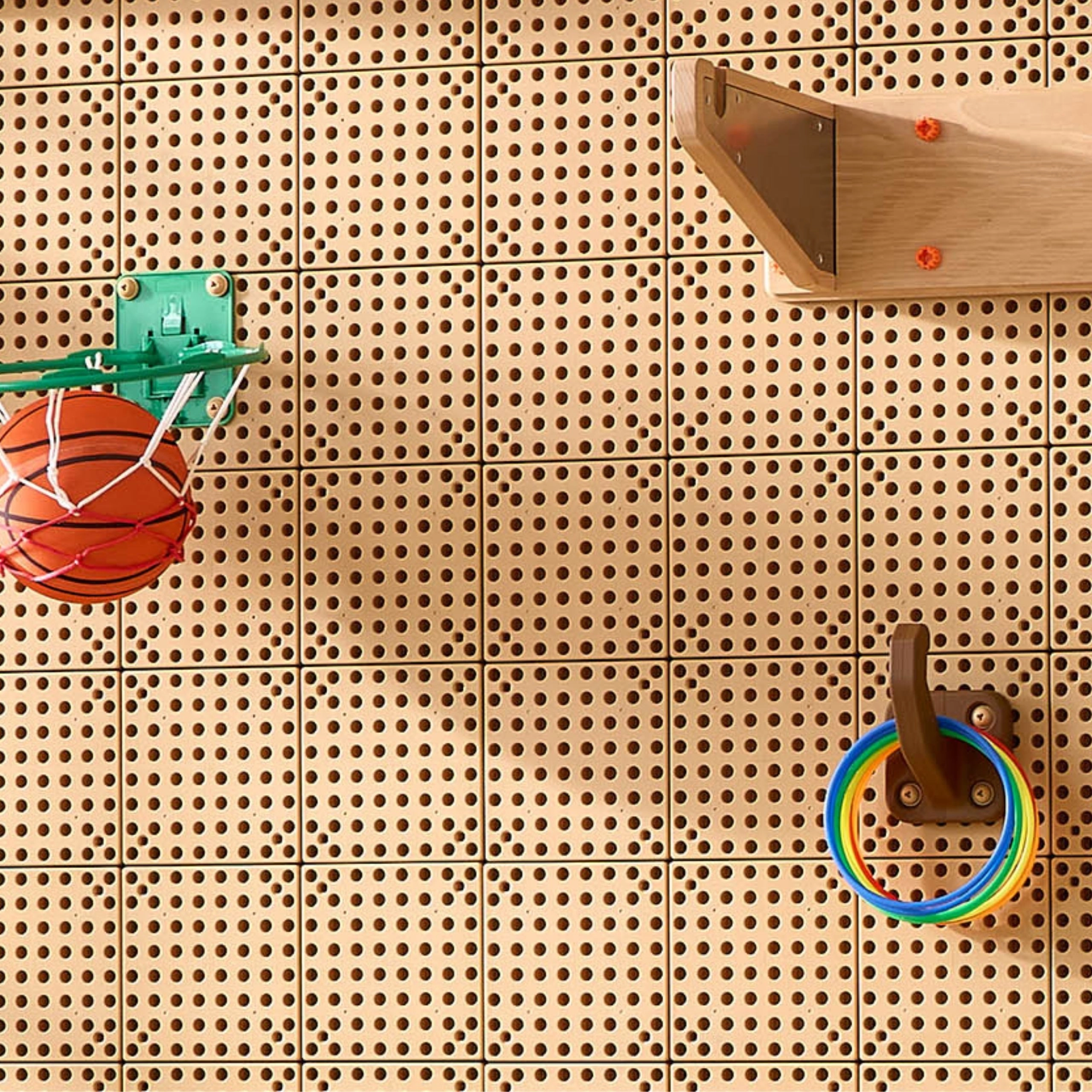Hak mocuje się bezpośrednio do perforowanej tablicy i jest gotowy do natychmiastowej zabawy. Stabilne zamocowanie zapewnia bezpieczne użytkowanie w grupie dzieci.