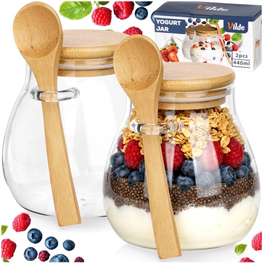 Dwa szklane kubeczki 440 ml z bambusowymi pokrywkami i łyżeczkami – idealne do serwowania i przechowywania deserów oraz przekąsek w domu i w podróży.