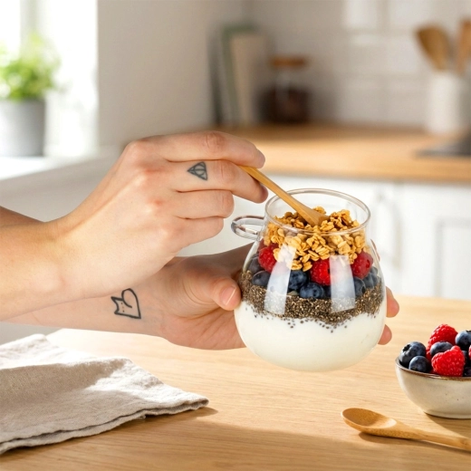 Odkryj stylowe i praktyczne kubeczki, które podkreślą Twoje domowe jogurty, puddingi chia i warstwowe desery. Przezroczyste szkło pięknie eksponuje zawartość, a bambusowa pokrywka z uszczelką chroni przed wysychaniem i przenikaniem zapachów. Zintegrowany uchwyt z boku utrzymuje łyżeczkę zawsze gotową do podania.