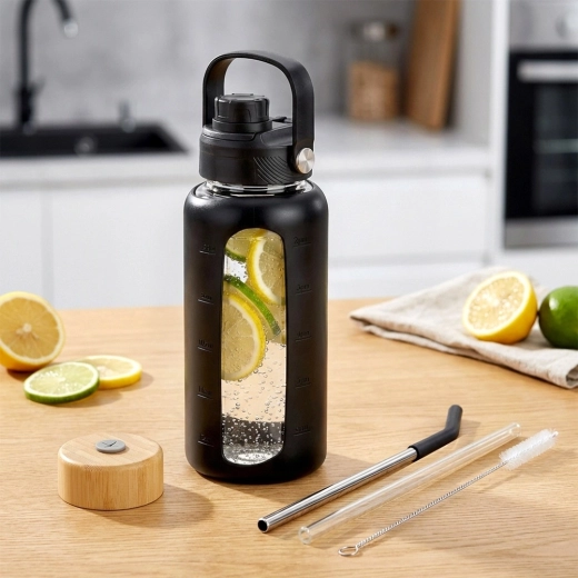 W zestawie znajdziesz dwie praktyczne pokrywki: sportową pokrywkę flip z ustnikiem i uchwytem do wygodnego noszenia oraz bambusową pokrywkę z otworem na słomkę. Dołączone są także dwie wielorazowe słomki (szklana i stalowa z silikonową końcówką) oraz szczoteczka do czyszczenia. Podziałka w ml (do 700 ml) i w uncjach (4–34 oz) oraz dzienne znaczniki czasowe (8–12 i 14–18) pomogą pić regularnie w ciągu dnia.
