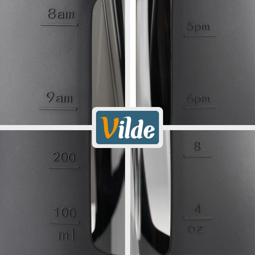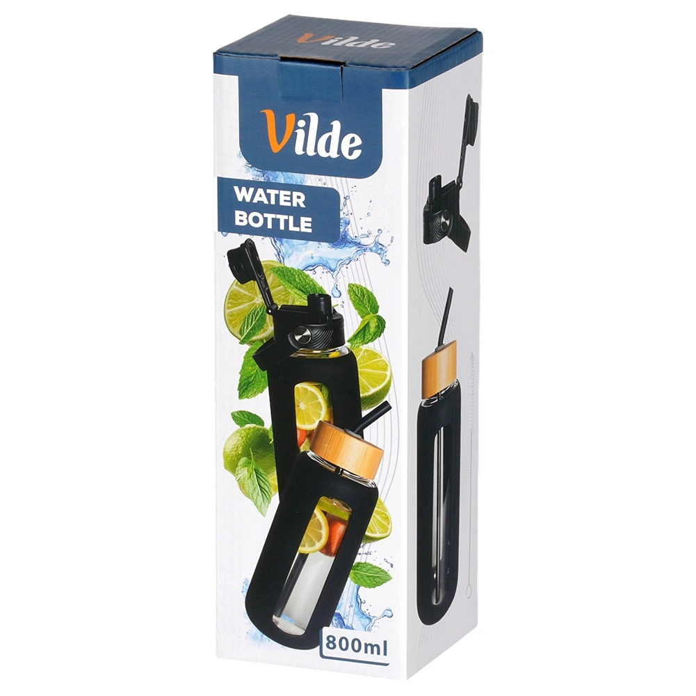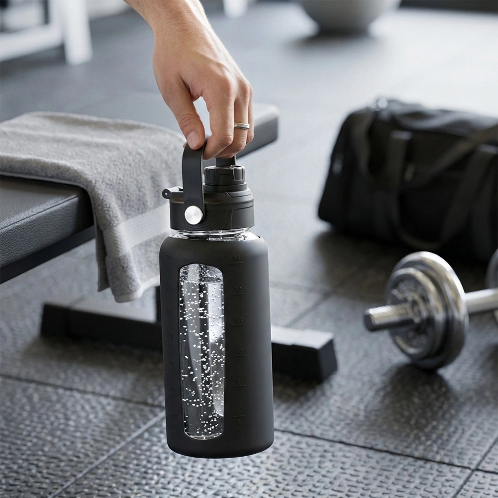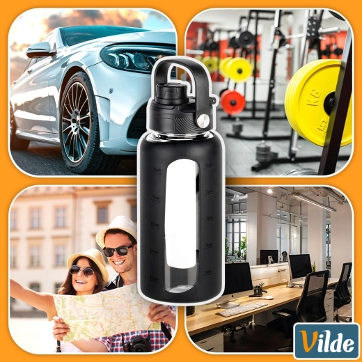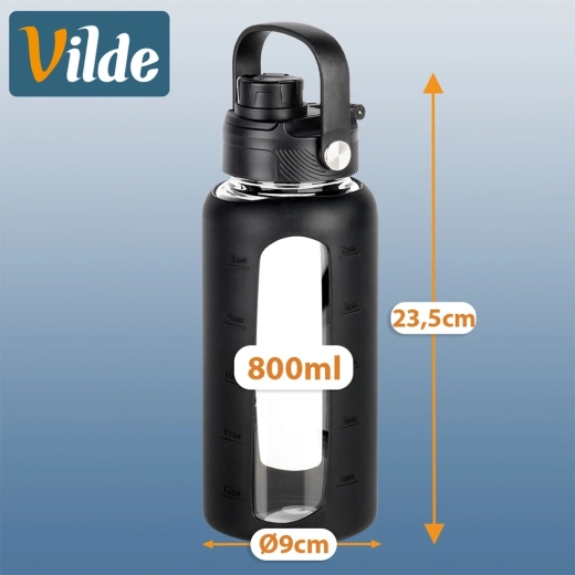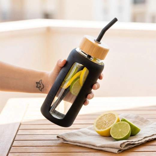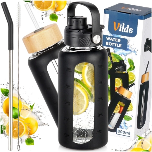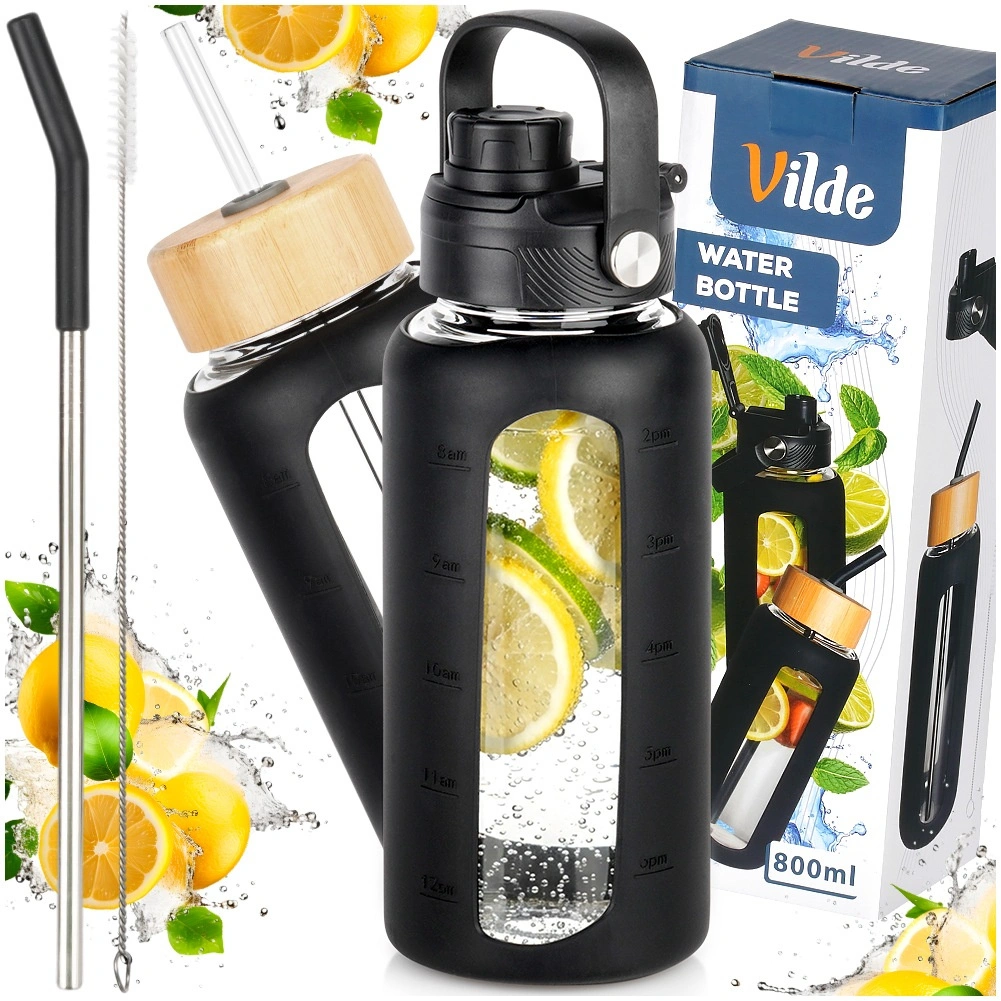 Stylowa szklana butelka na wodę o pojemności 800 ml oferuje trwałe szkło borokrzemowe, ochronne silikonowe etui z okienkiem i podziałką oraz dwie wymienne pokrywki do picia przez słomkę lub sportowy ustnik. Dzięki podziałce w ml i oz oraz znacznikom czasowym łatwo monitorujesz dzienne nawodnienie. Odpowiednia do gorących i zimnych napojów, do domu, pracy i w podróży.