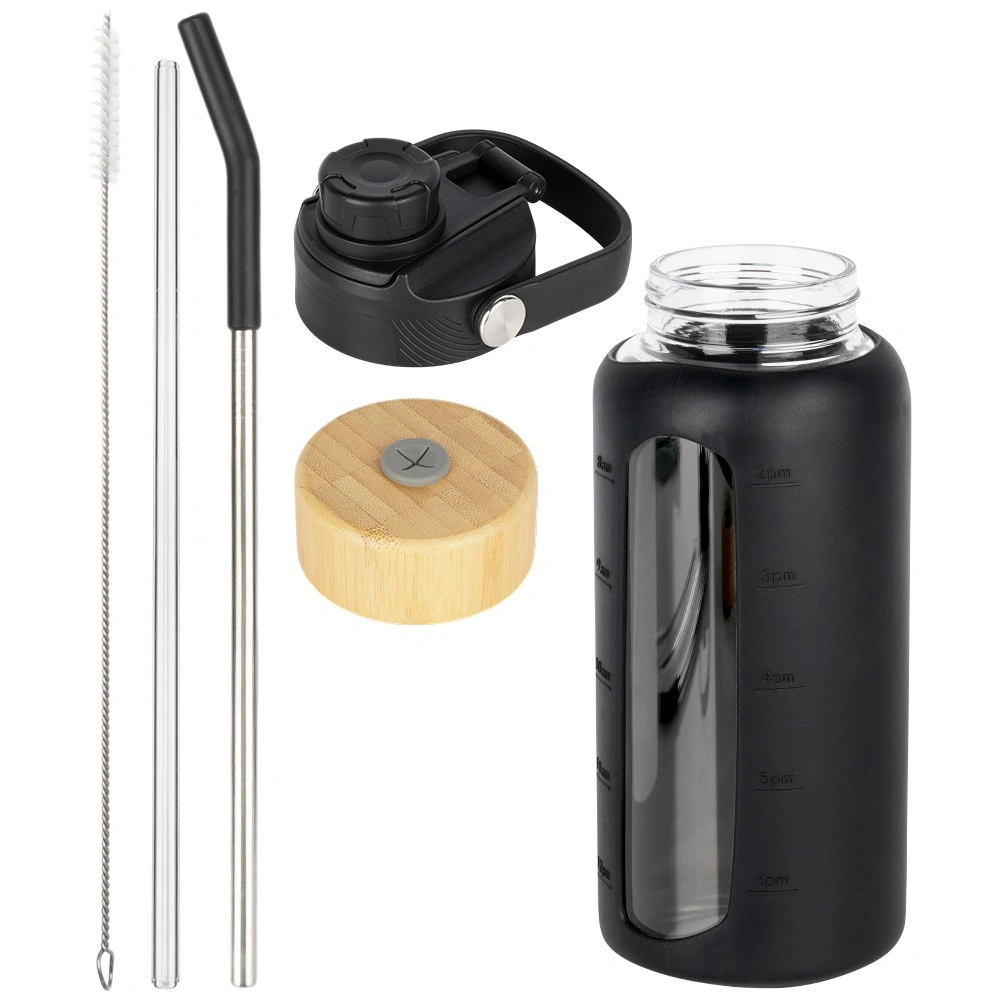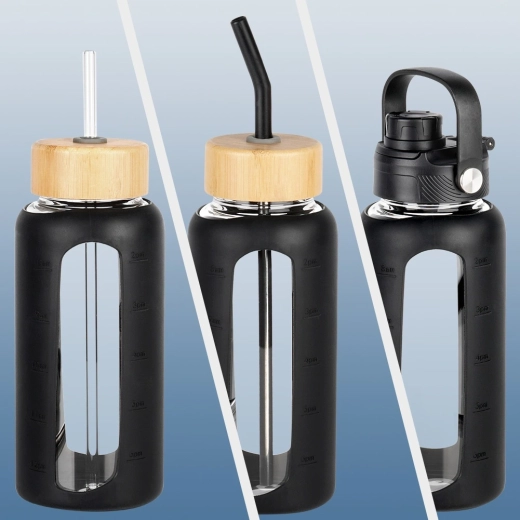 Sportowa pokrywka flip z ustnikiem i uchwytem dla łatwego przenoszenia oraz bambusowa pokrywka z otworem na słomkę. W zestawie szklana i stalowa słomka z silikonową końcówką oraz szczoteczka do czyszczenia.