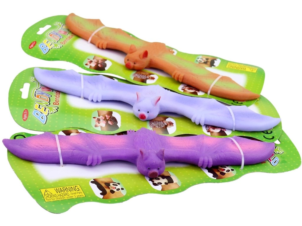 Zabawna i bezpieczna zabawka dla dzieci od 3 lat: elastyczny nietoperz z miękkiej gumy o długości ok. 25 cm. Świetnie się rozciąga, ugniata i wygina, pomaga rozładować napięcie i zająć ręce. Dostępna w żywych kolorach i pakowana na karcie, co ułatwia przechowywanie oraz wręczanie w prezencie.