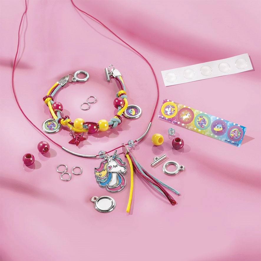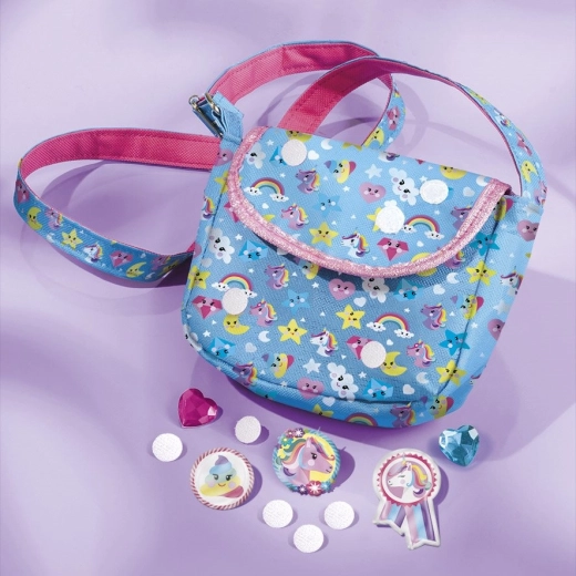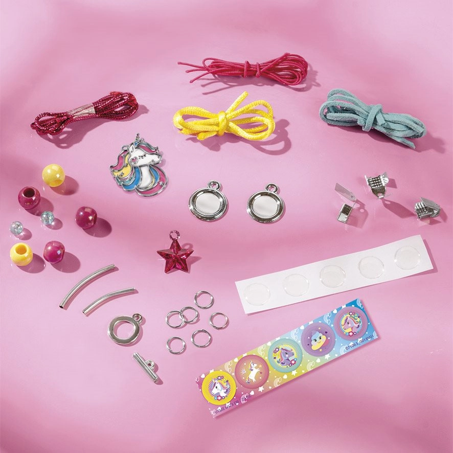 Ten magiczny kreatywny zestaw zapewnia podwójną zabawę: tworzenie biżuterii i ozdabianie torebki. Dzieci z łatwością wykonają bransoletkę i naszyjnik z koralików oraz zawieszki z jednorożcem, a następnie udekorują materiałową torebkę za pomocą 3D guzików, rzepowych naklejek i błyszczących kamyczków w kształcie serca.