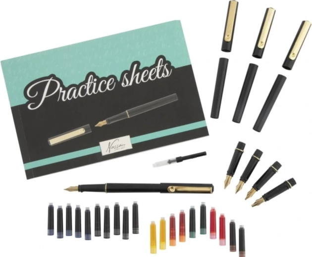 Zestaw kaligraficzny NASSAU 35 szt. to doskonały wybór dla każdego, kto chce poprawić swoje pismo lub zanurzyć się w świecie letteringu. Dzięki różnym szerokościom stalówek i bogatej palecie nabojów z atramentem łatwo stworzysz oryginalne napisy, życzenia, zaproszenia oraz dekoracyjne liternictwo do kreatywnych projektów.