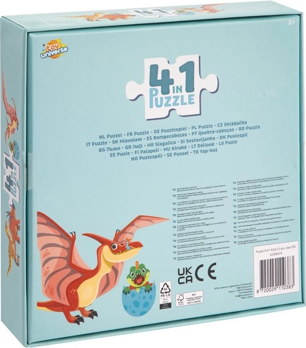 Odkryj zabawne i edukacyjne progresywne puzzle 4w1 z motywem dinozaurów od TOY UNIVERSE. Cztery układanki o 4, 6, 9 i 12 elementach o stopniowo rosnącym poziomie trudności rozwijają małą motorykę, logiczne myślenie i cierpliwość dzieci. Każda ułożona układanka ma kompaktowy wymiar około 17,4 × 17,4 cm.