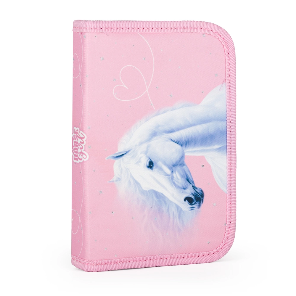 Lekki i wygodny zestaw szkolny dla małych uczennic z motywem konia. Zawiera pojemną tornistrę z ergonomicznym systemem pleców, worek na kapcie oraz jednokomorowy piórnik. Dzięki odciążonej konstrukcji tornister waży jedynie 970 g, ma elementy odblaskowe, magnetyczne zapięcie oraz praktyczny podział dla przejrzystego przechowywania przyborów szkolnych.