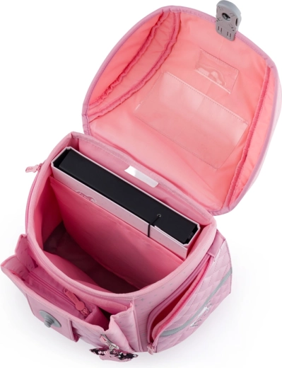 Przemyślane wnętrze z przegrodą, wyściełaną kieszenią i praktycznymi schowkami utrzyma porządek w podręcznikach, zeszytach i przekąskach. Magnetyczne zapięcie zapewnia szybkie i łatwe otwieranie, solidne dno z nóżkami trzyma kształt i chroni zawartość. Elementy odblaskowe zwiększają bezpieczeństwo w drodze do i ze szkoły.