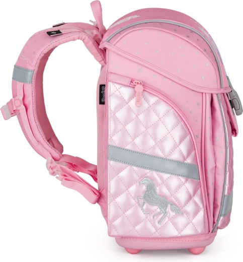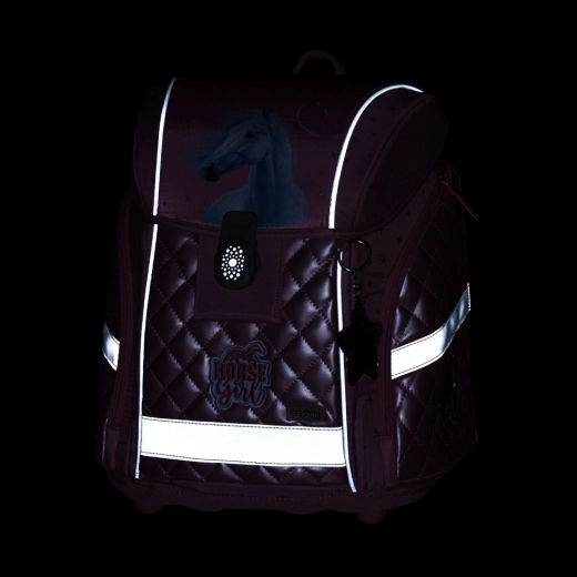 Stylowy szkolny plecak Premium Light z romantycznym motywem koni zachwyci małe uczennice już od wzrostu ok. 121 cm. Dzięki odciążonej konstrukcji i sprytnej ergonomii nosi się wyjątkowo wygodnie: ma oddychane, wyściełane plecy (Anatomic Bag System), szerokie, miękkie szelki, pas piersiowy oraz pasy dociągające dla prawidłowego osadzenia na plecach.