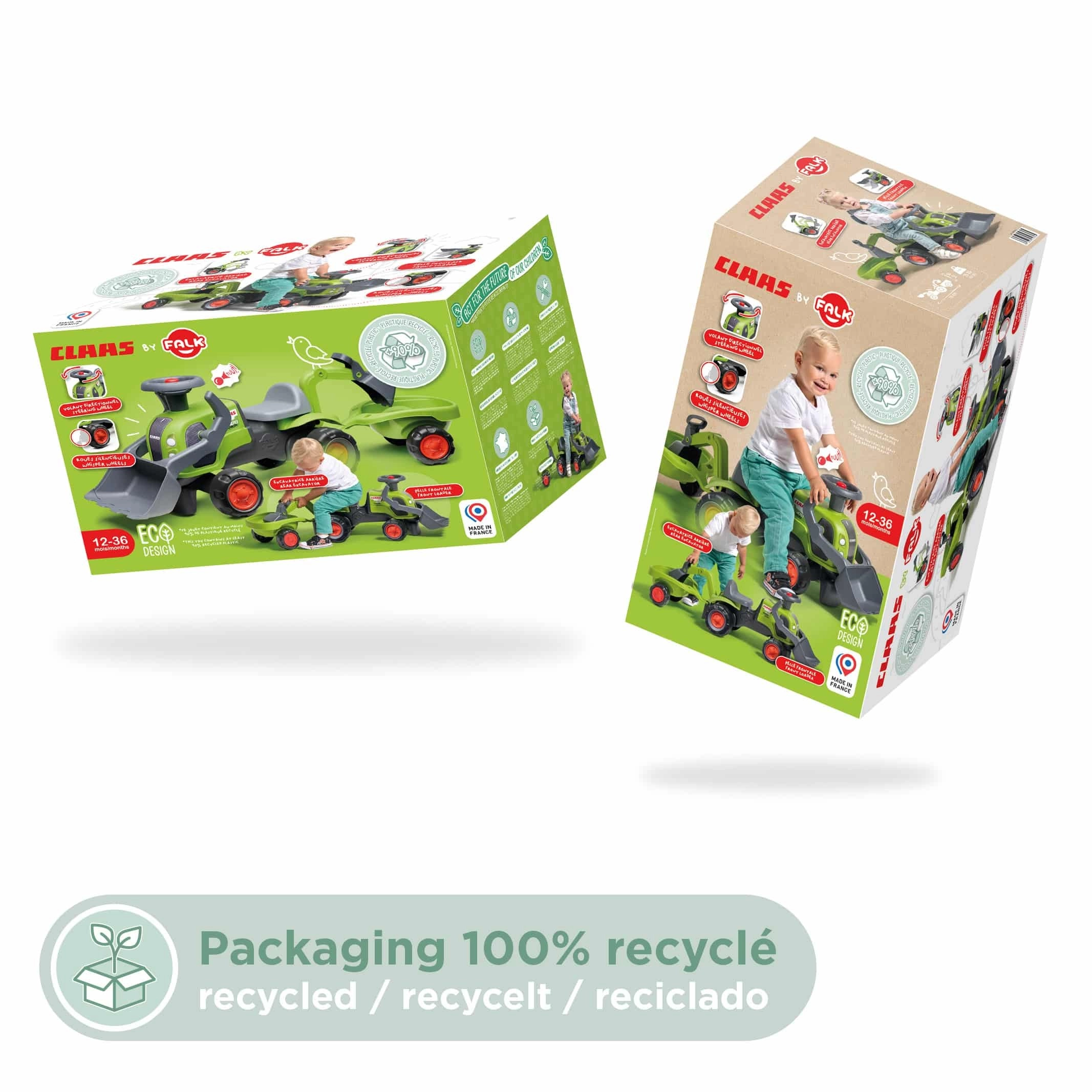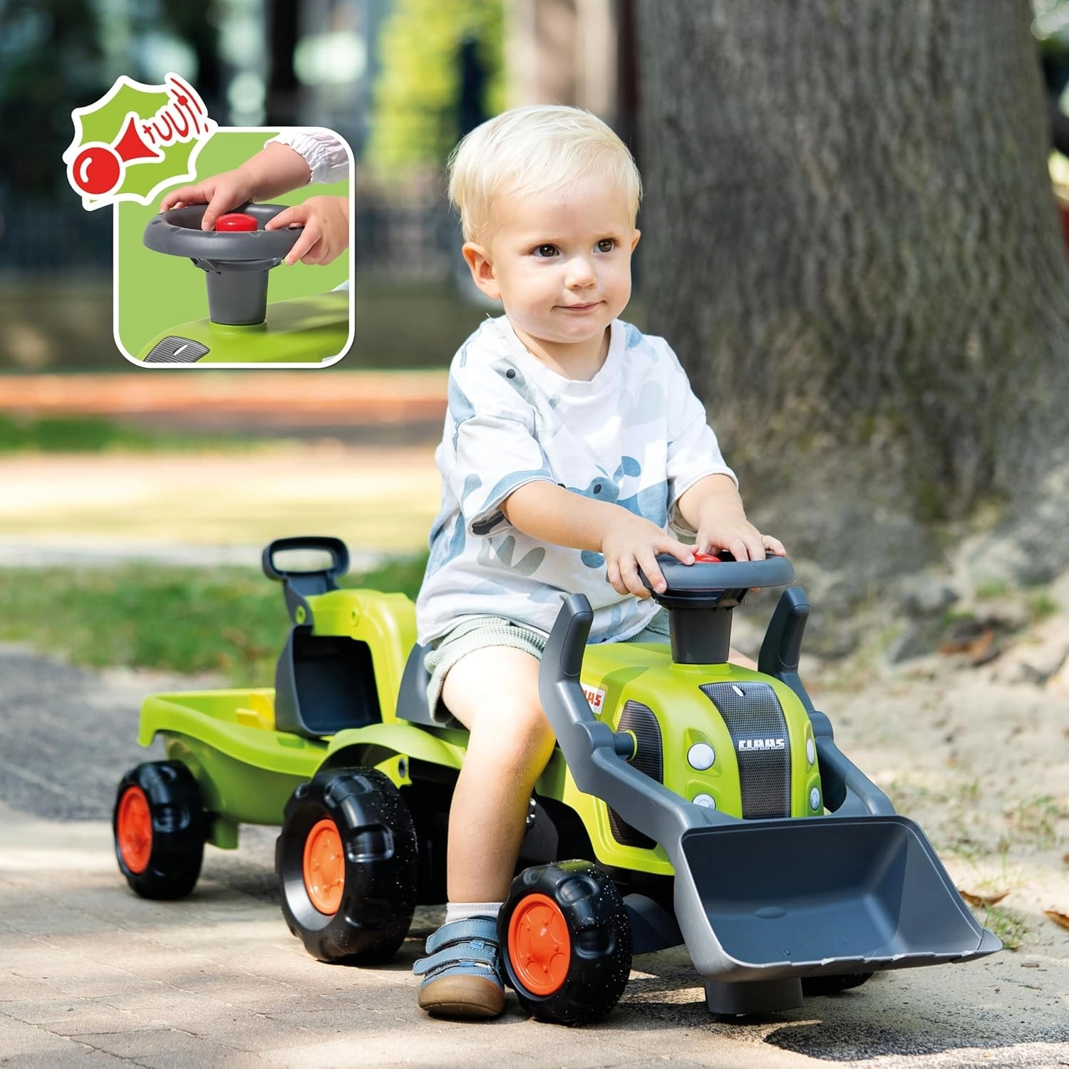 W zestawie znajduje się jeździk traktor na licencji CLAAS, odłączana przyczepa, przednia łyżka, tylne ramię koparki oraz kierownica z klaksonem – gotowe do akcji na każdej „budowie”.