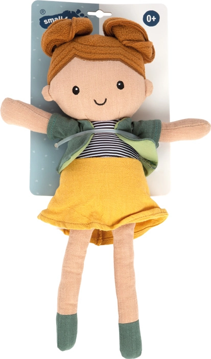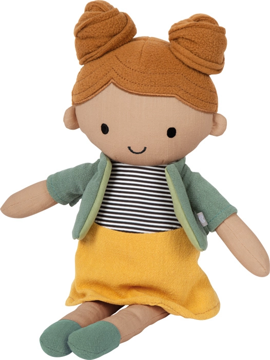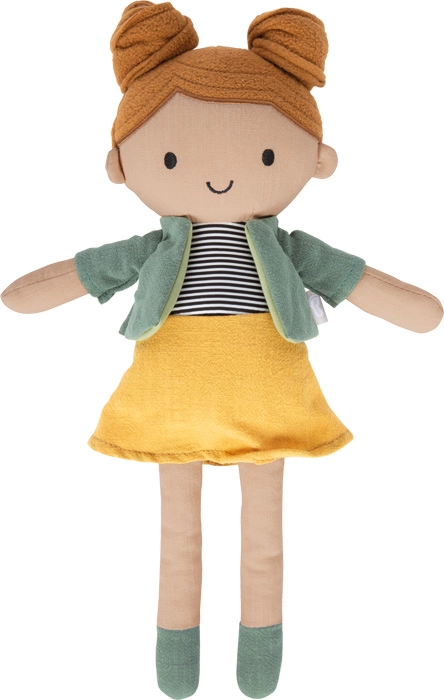 Maja nosi żółtą spódniczkę, pasiasty top i zielony sweterek/kurtkę, którą można łatwo zakładać i zdejmować. To naturalnie trenuje małą motorykę oraz samodzielność. Lalka jest prana ręcznie, dzięki czemu zachowuje kształt, czystość i długą żywotność.