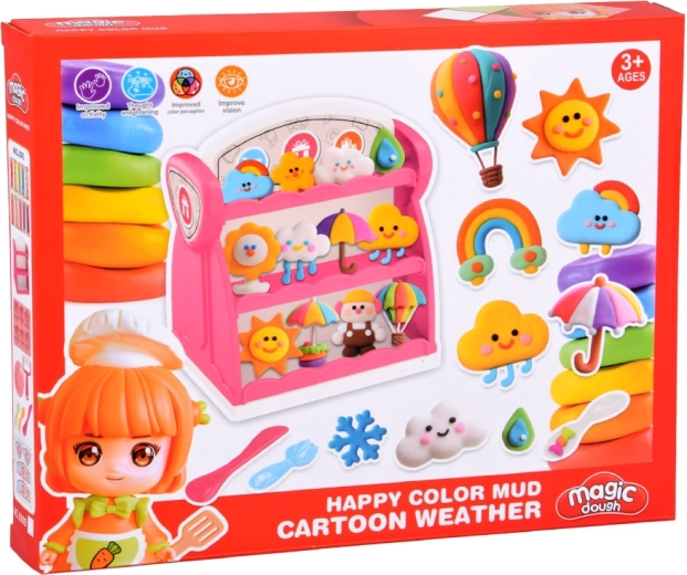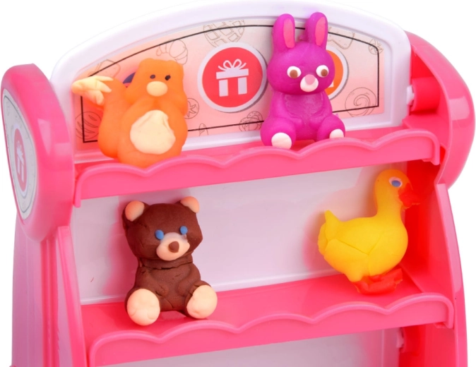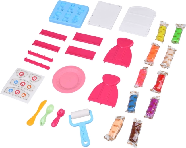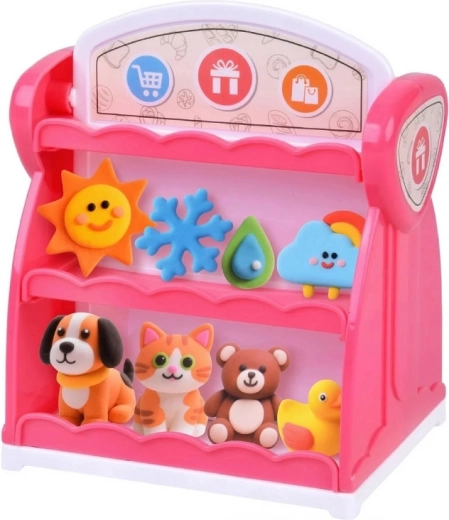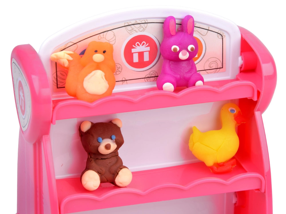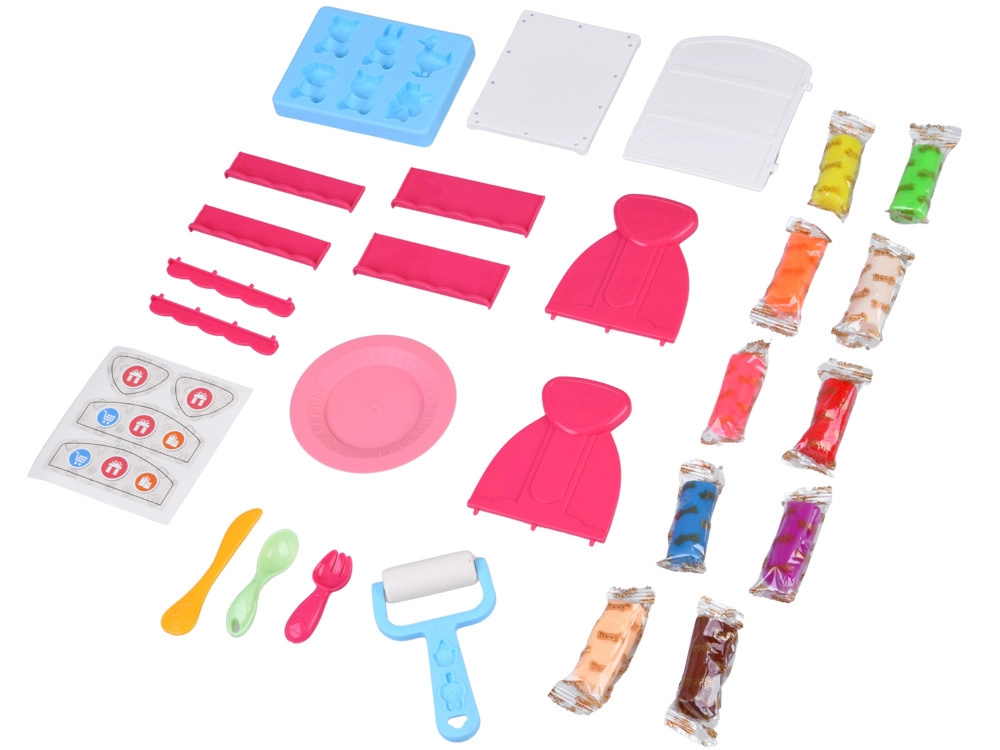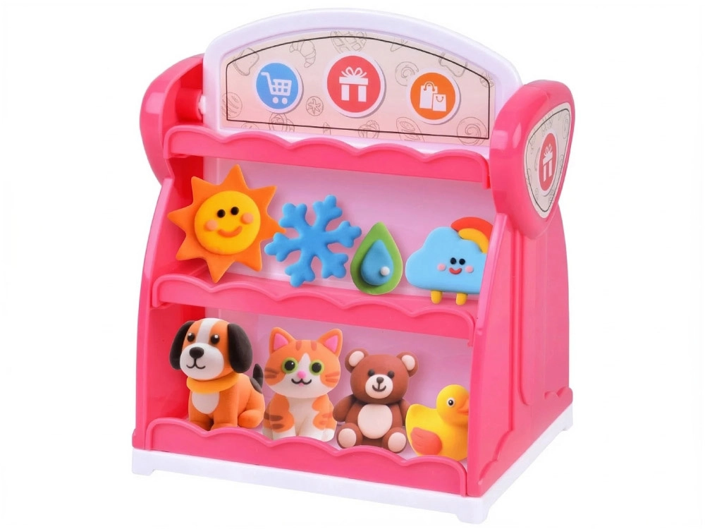 Ten bogaty zestaw plasteliny zamieni dziecięcy pokój w mały wystawowy sklepik. Miękka i plastyczna plastelina w 10 kolorach łatwo się formuje, a foremki pozwalają w mgnieniu oka tworzyć urocze zwierzątka i motywy „pogodowe”. Gotowe dzieła dzieci dumnie ustawią na dwustronnym różowym regale z półkami.