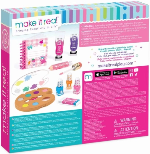 - Paleta cieni do powiek z aplikatorem, błyszczyki do ust, balsam/błyszczyk w formie kredki, 3× lakier do paznokci, pilnik do paznokci, szkicownik, naklejki/akcesoria zgodnie z opakowaniem