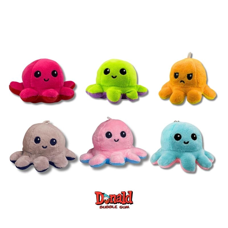 Odkryj figlarny świat niespodzianek! Odwracalna pluszowa ośmiornica skrywa dwa różne wyrazy twarzy – wystarczy ją po prostu przewrócić na drugą stronę, aby zmienić nastrój i wygląd. W każdej kapsule dodatkowo znajdziesz 5 legendarnych gum do żucia DONALD, które ucieszą smakiem i nostalgią.