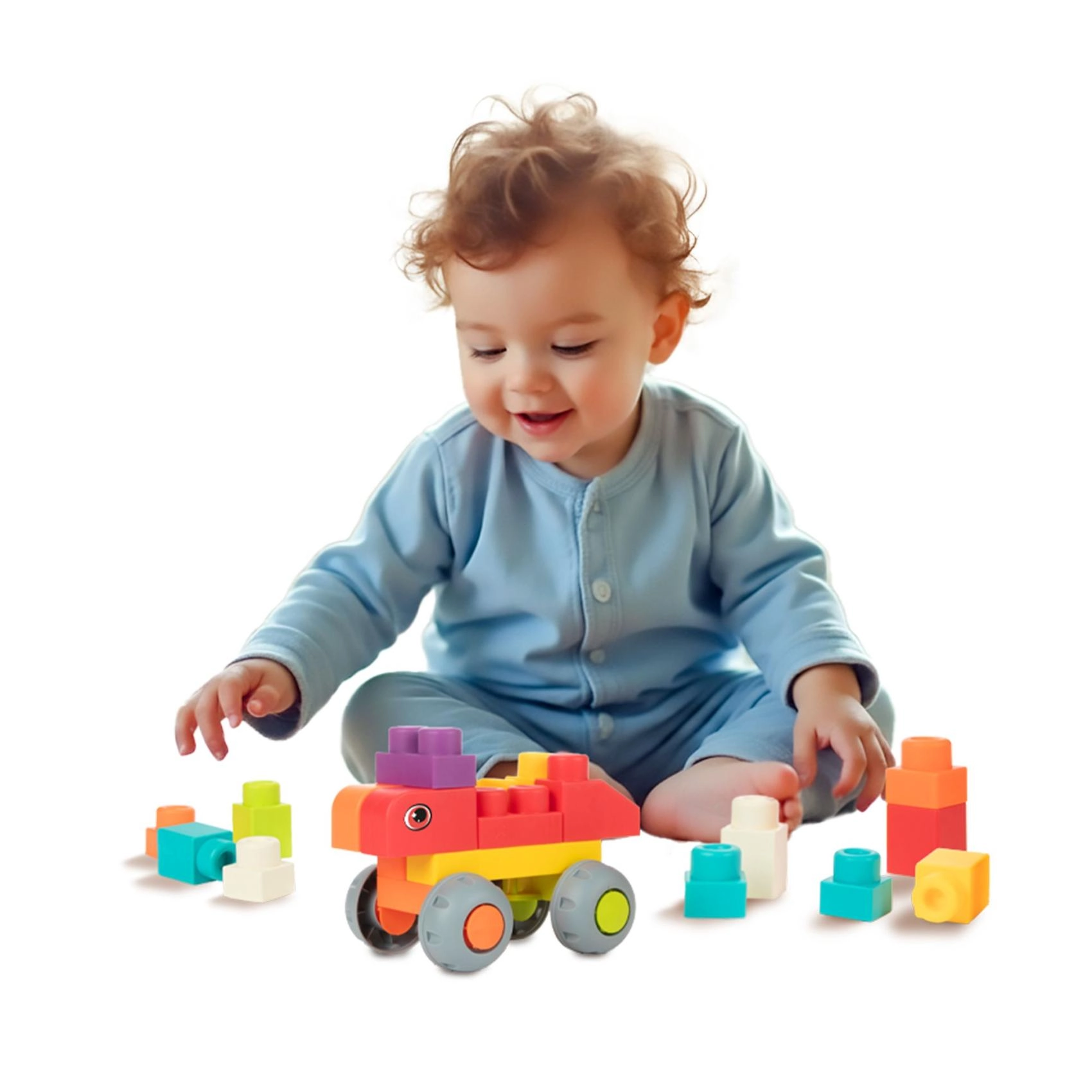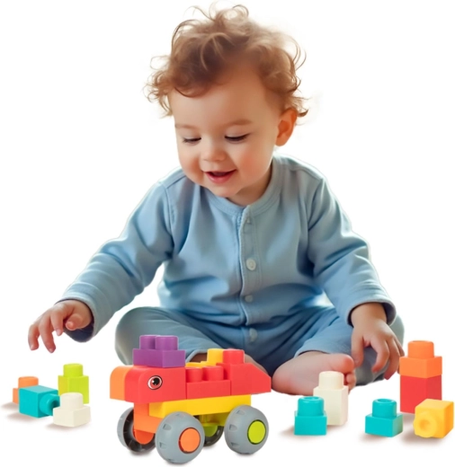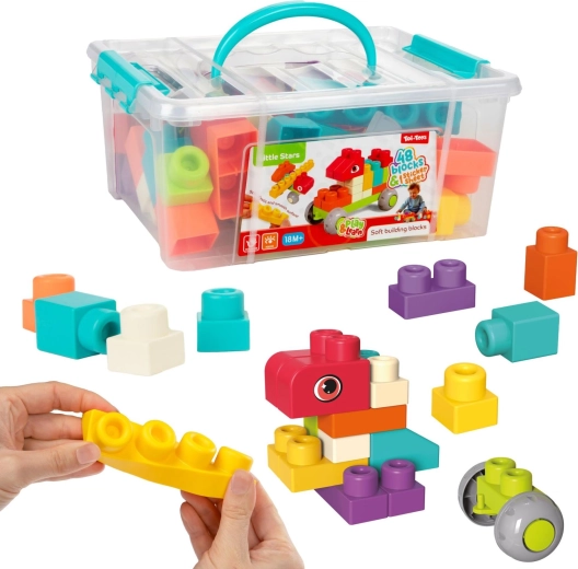 Ta miękka układanka to idealny pierwszy wybór dla najmłodszych budowniczych. Dzięki zaokrąglonym krawędziom i elastycznym elementom klocki są bezpieczne dla małych rączek, a jednocześnie wystarczająco solidne do stabilnych konstrukcji. Zestaw zawiera 48 kolorowych elementów, w tym klocki z nadrukiem oczek oraz kółka do prostych jeżdżących pojazdów.
