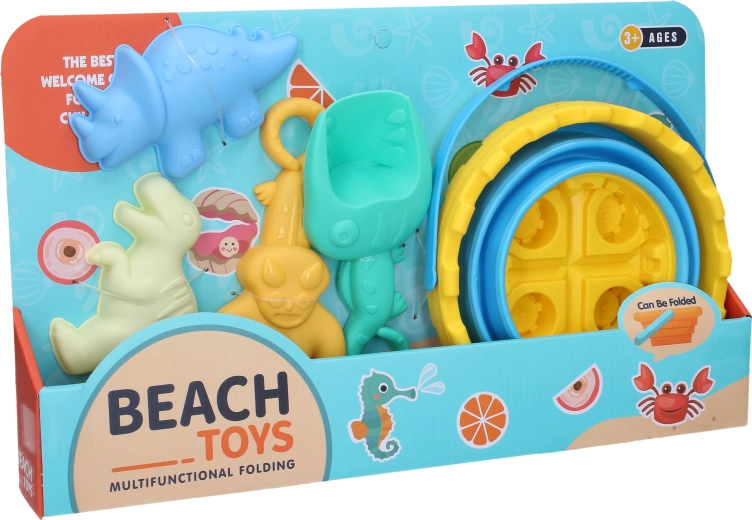 - Składane wiaderko, łopatka, grabki, 2× foremka
