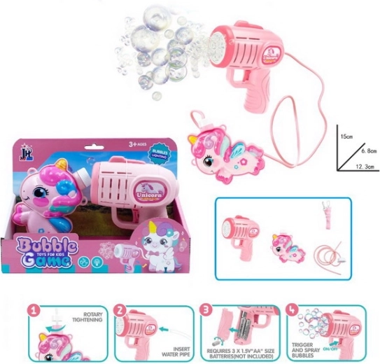 Wystarczy włożyć 3× baterie AA (brak w zestawie) i nacisnąć spust – pistolet automatycznie zacznie tworzyć efekt obfitych baniek. Kompaktowe wymiary 12,3 × 6,8 × 15 cm ułatwiają przenoszenie i przechowywanie.