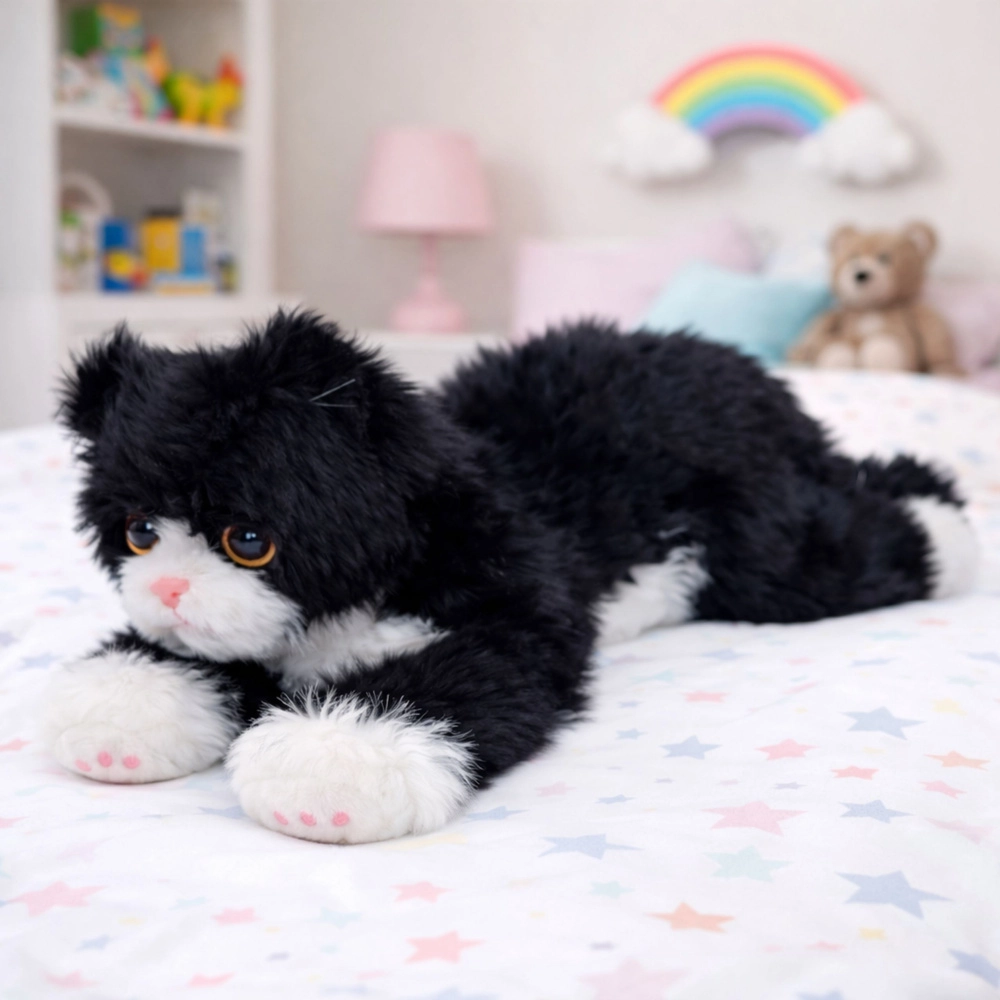 Uroczy pluszowy kot w czarno‑białym kolorze jest miękki, delikatny i gotowy do przytulania. Dzięki realistycznemu wykonaniu, miękkiemu futerku i bezpiecznym, przyjemnym materiałom dzieci szybko go pokochają jako towarzysza do zabawy i spania.