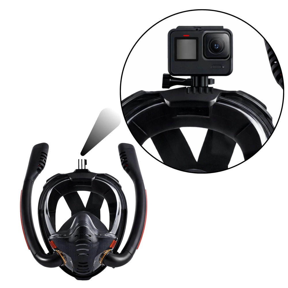 Zintegrowana komora oddechowa umożliwia oddychanie nosem i ustami bez ustnika. Panoramiczna soczewka zapewnia szerokie pole widzenia 180° dla niczym niezakłóconego obrazu.