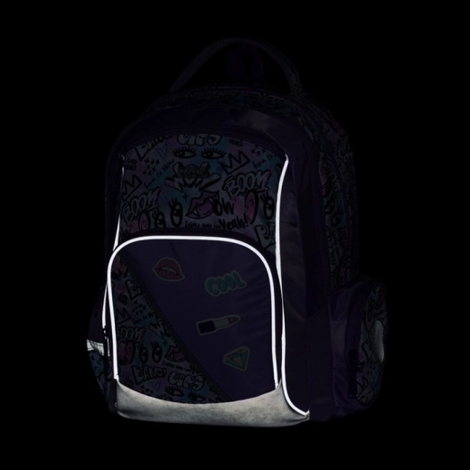 Pojemna komora główna, praktyczne kieszenie wewnętrzne, przedni organizer oraz boczne kieszenie (na zamek i otwarta) na butelkę i drobiazgi utrzymują szkolne wyposażenie zawsze pod ręką.