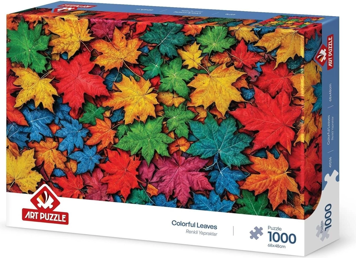 Odkryj kojący świat układania puzzli Kolorowe liście. Intensywne barwy i wyraziste kształty liści ułatwiają orientację, dzięki czemu układanie sprawi przyjemność zarówno początkującym, jak i zaawansowanym. Gotowe dzieło o wymiarach 68 × 48 cm świetnie sprawdzi się jako stylowa dekoracja do salonu, gabinetu czy pokoju dziecięcego.