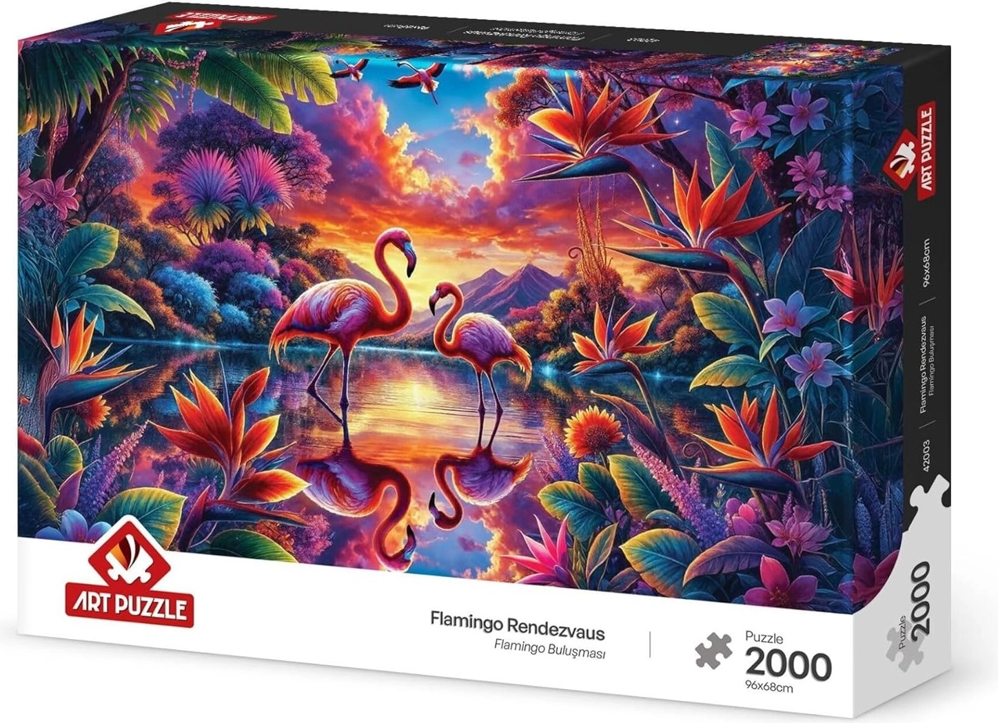 Ciesz się godzinami relaksu z puzzlami „Spotkanie flamingów” o 2000 elementach, które po ułożeniu stworzą imponujący obraz o wymiarach 96 × 68 cm. Wysokiej jakości elementy precyzyjnie do siebie pasują, a producent ART PUZZLE oferuje także usługę dosłania brakującego elementu.