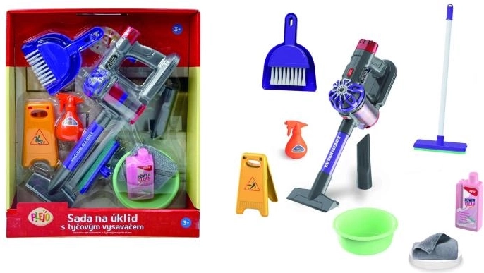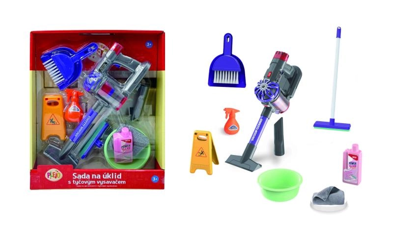 W opakowaniu znajdziesz wszystko, co potrzebne do perfekcyjnego „sprzątania” dziecięcego pokoju: odkurzacz, mop, zmiotkę z szufelką, miskę, atrapy środków czyszczących oraz ostrzegawczy znak Śliska podłoga. Odkurzacz działa na 2× 1,5 V baterie AA (brak w zestawie), więc zabawa może zacząć się w mgnieniu oka.