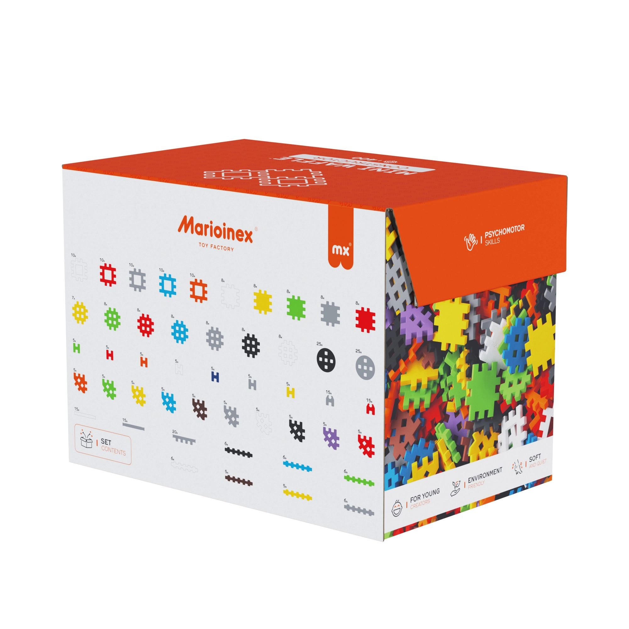 • 400 elementów o różnych kształtach i kolorach do różnorodnych konstrukcji