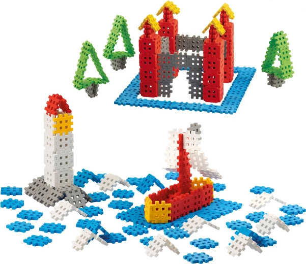 Duża liczba kolorowych, „gofrowych” elementów pozwala budować postacie, domki i pojazdy – od pierwszych prób po dopracowane modele 3D.