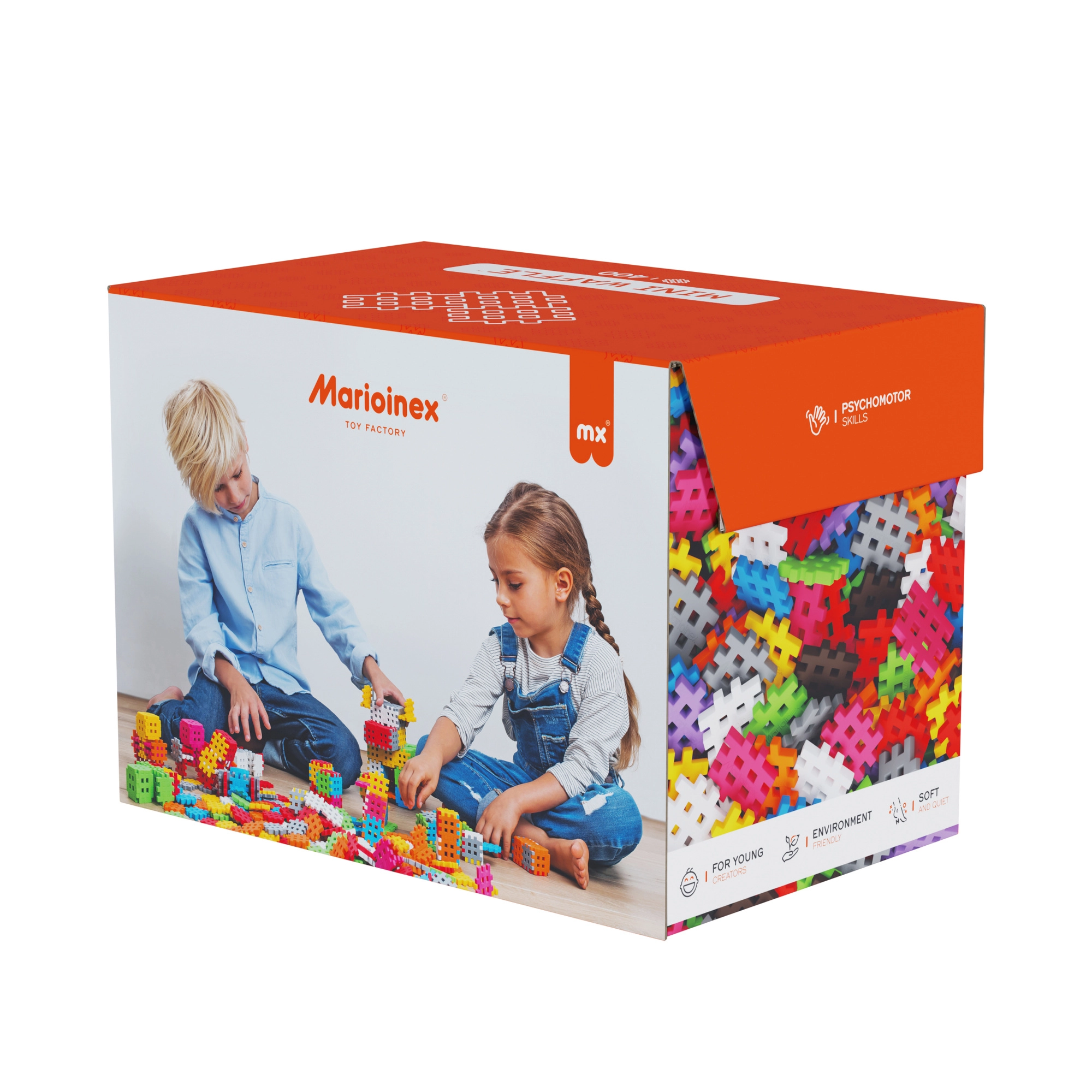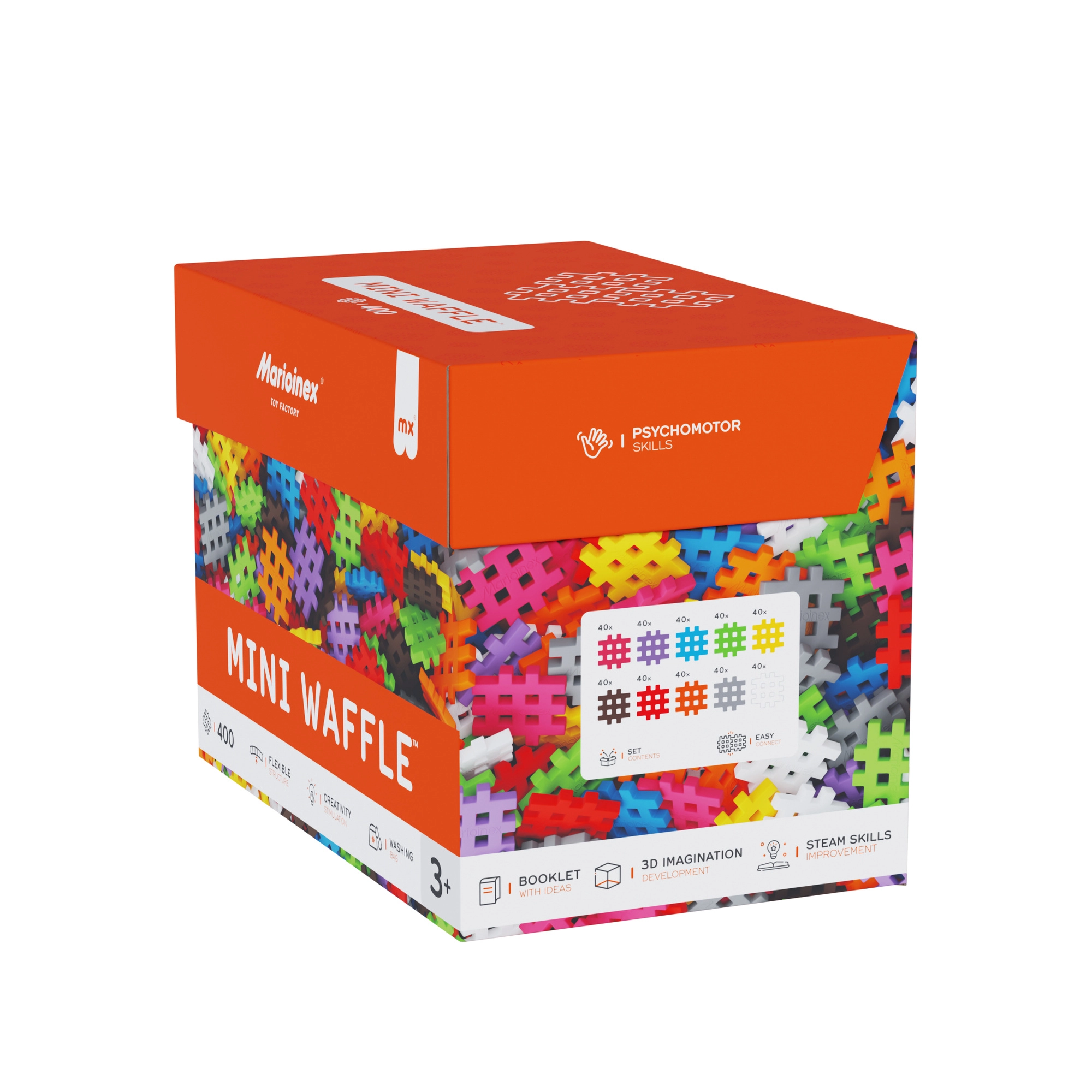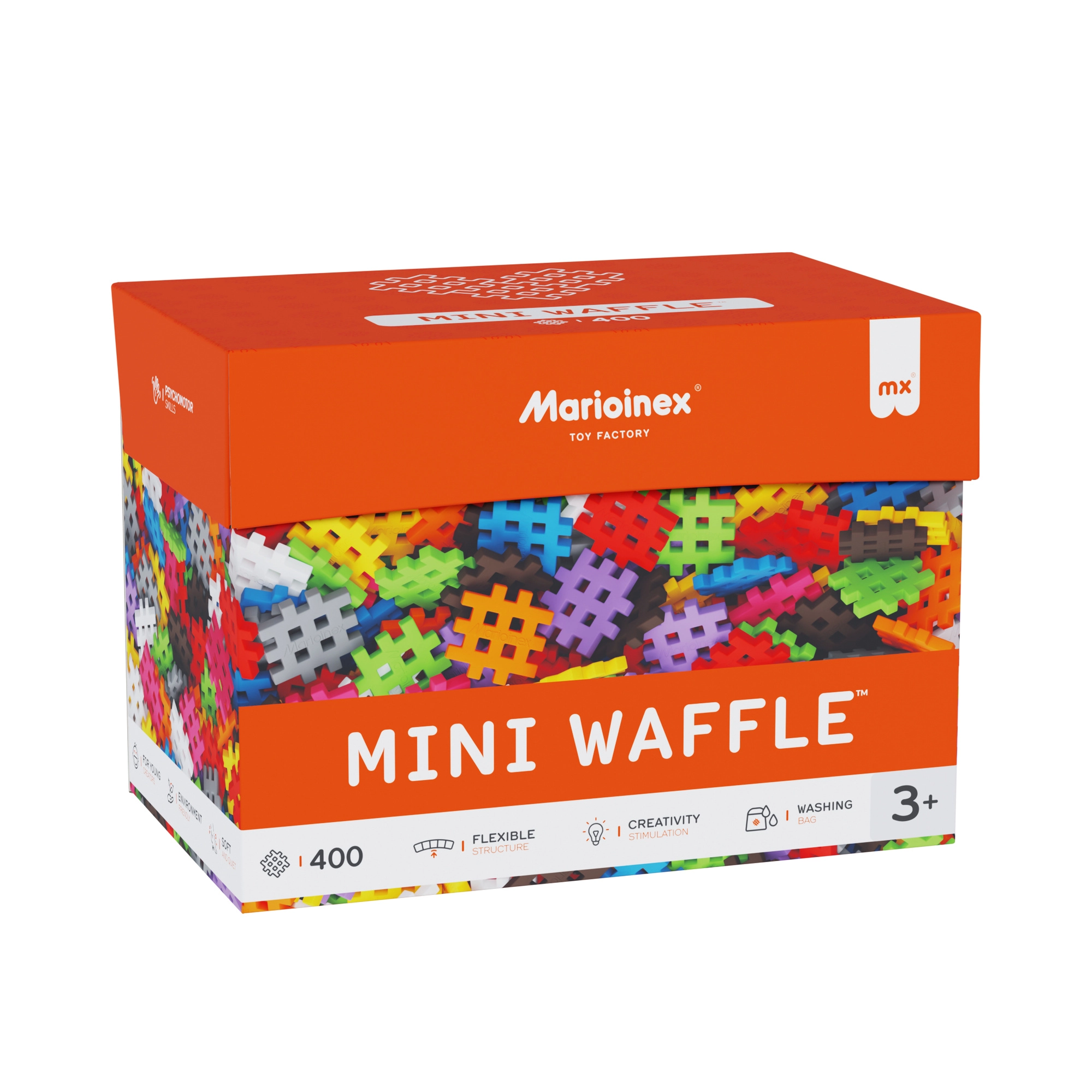 Klocki Marioinex Mini Waffle to radosna droga do nauki. Dzięki miękkiemu materiałowi i sprytnemu kształtowi elementy łatwo się łączą i rozłączają, a małe dłonie wygodnie je chwytają. 400 części w żywych kolorach zachęca do swobodnego tworzenia oraz do podążania za instrukcjami – od prostych modeli po pomysłowe konstrukcje 3D.