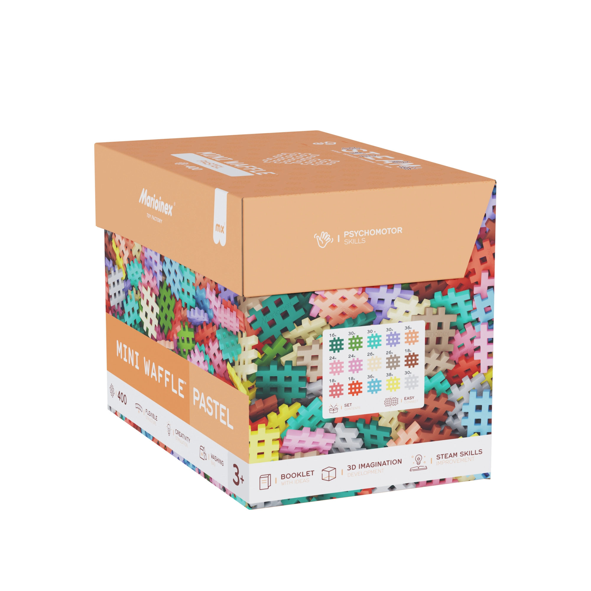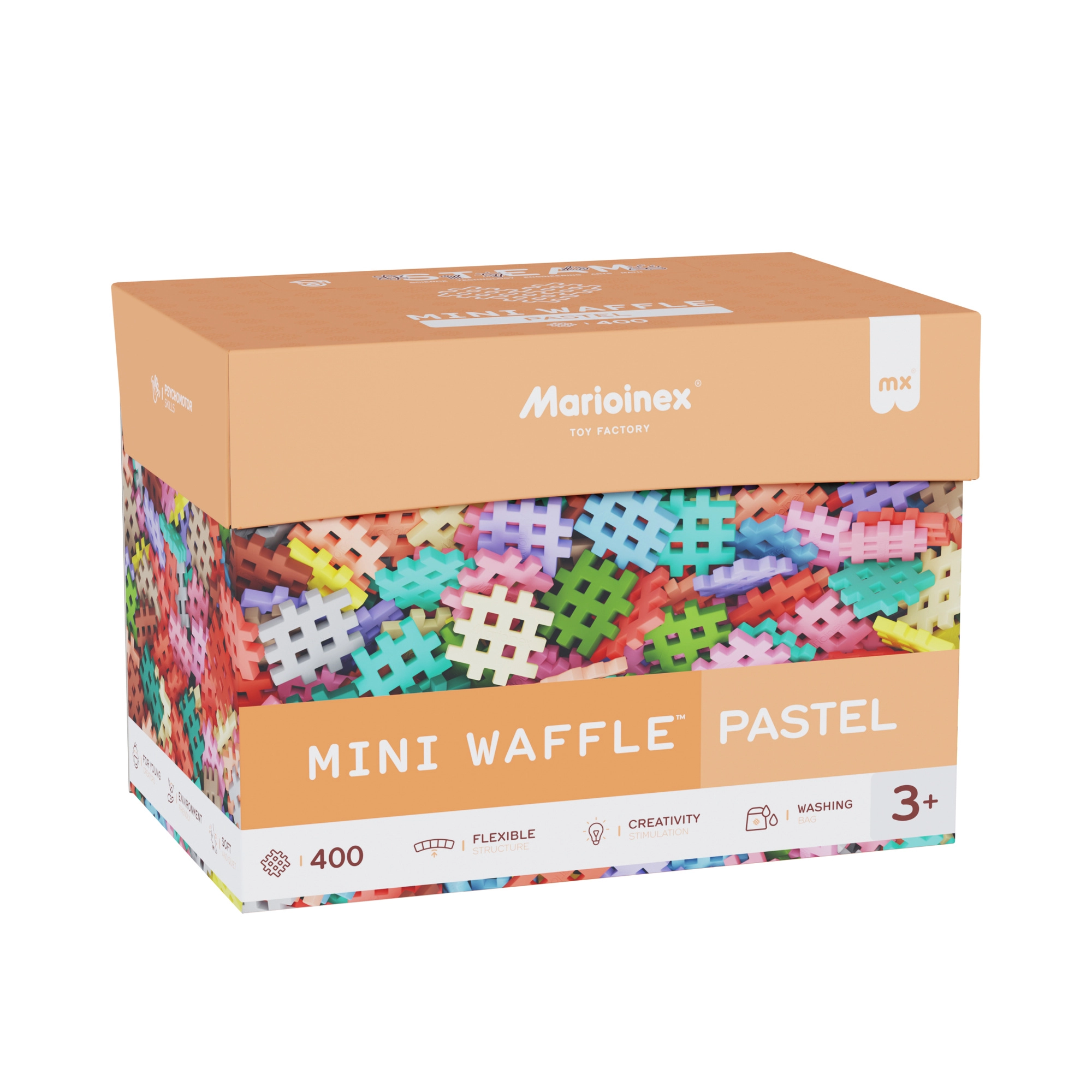 Odkryj świat tworzenia z zestawem Mini Waffle Pastel od MARIOINEX400 elastycznych elementów w delikatnych pastelowych kolorach wspiera kreatywność, małą motorykę i logiczne myślenie. Miękki, bezpieczny materiał przyjemny w dotyku oraz sprytny „gofrowy” kształt umożliwiają łatwe łączenie i rozdzielanie, zapewniając nieskończone możliwości budowania.