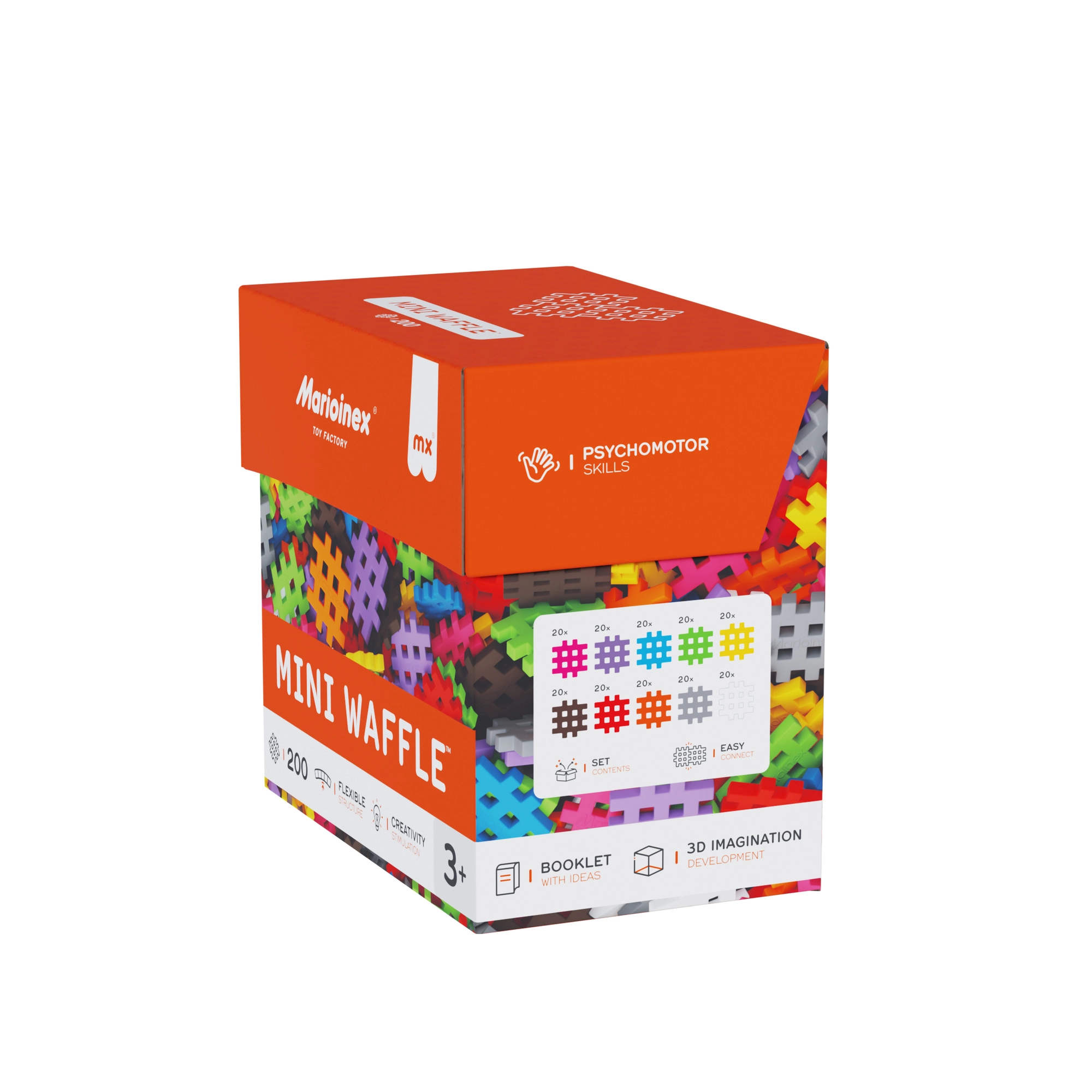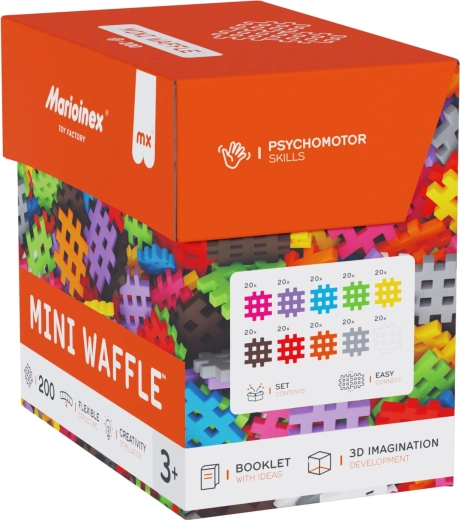 Klocki Marioinex Mini Waffle oferują szerokie możliwości tworzenia – od prostych obiektów po zaawansowane konstrukcje 3D. Elementy mają miękką, przyjemną fakturę i łatwo się łączą oraz rozłączają, co wspiera łagodne uczenie się, koncentrację i cierpliwość. Dzięki unikalnemu kształtowi idealnie pasują do dziecięcych rąk i sprzyjają samodzielnej zabawie.
