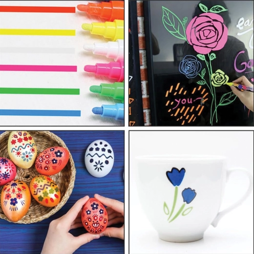 Markery kryjąco piszą po różnych gładkich materiałach: witrynach, kubkach, talerzach, dekoracjach czy wielkanocnych pisankach.