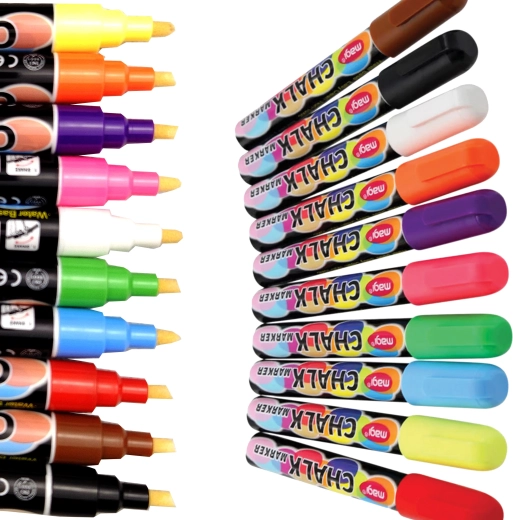 Odkryj wygodną alternatywę dla klasycznej kredy. Płynny kredowy atrament doskonale przylega do gładkich powierzchni (tablice, szkło, metal, ceramika), a jednocześnie łatwo się ściera wilgotną ściereczką bez pyłowych resztek. Markery sprawdzą się na lekcjach, spotkaniach firmowych, tablicach menu, weselnych dekoracjach i w dziecięcych pracach plastycznych.