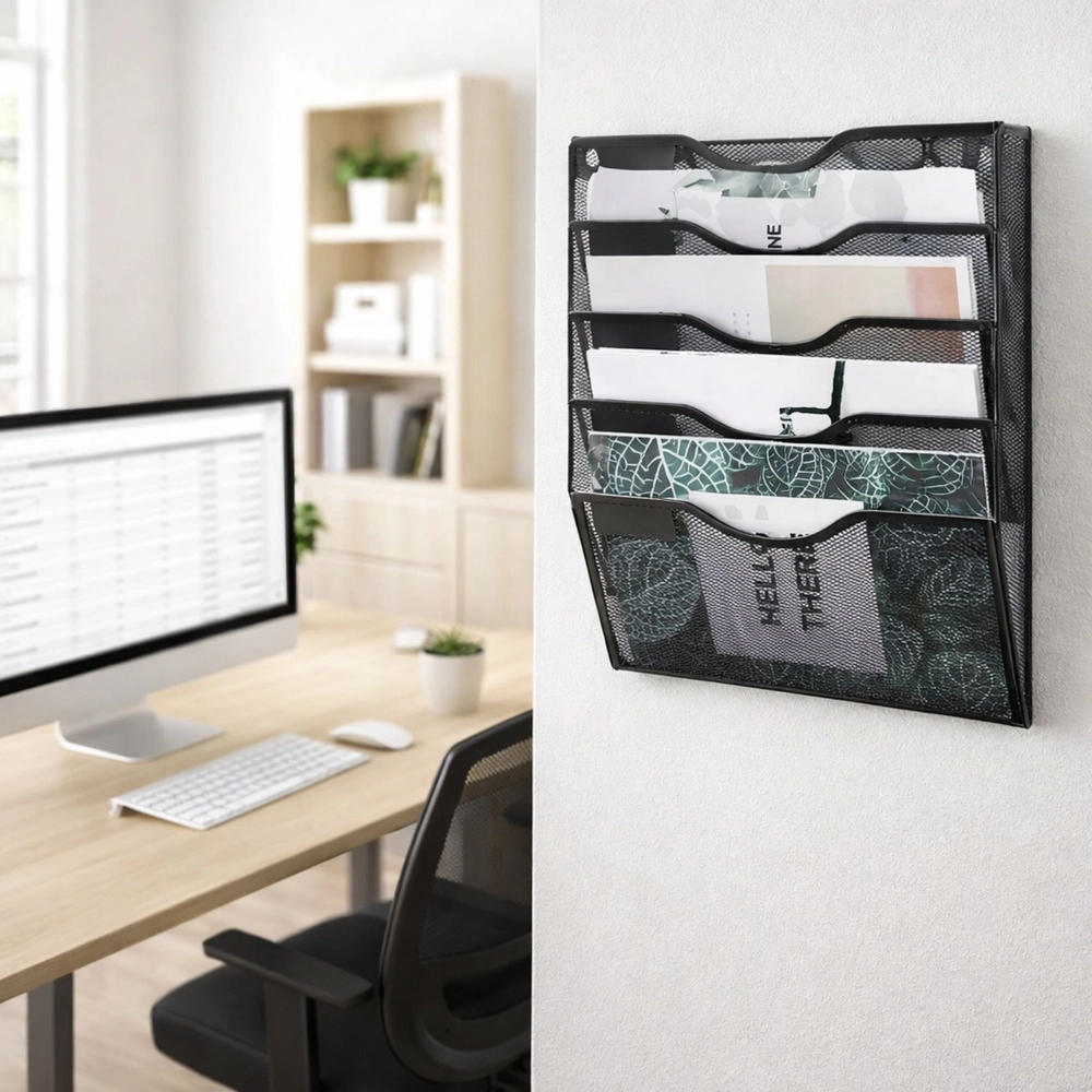 Praktyczny ścienny segregator pomoże utrzymać porządek w biurze, recepcji i domowym gabinecie. Pięć pionowych kieszeni przejrzyście posegreguje dokumenty, teczki, korespondencję i czasopisma, a metalowa siatka zapewni widoczność zawartości i cyrkulację powietrza.