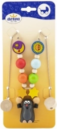Zawieszka na wózek Krtek to idealna pomoc dla rodziców, którzy chcą zająć swoje dzieci podczas spacerów i jednocześnie wprowadzić je w świat bajkowego bohatera Krecika. Drewniane elementy i tekstylnie elementy zapewniają stymulację wzroku i dotyku Twojego dziecka.