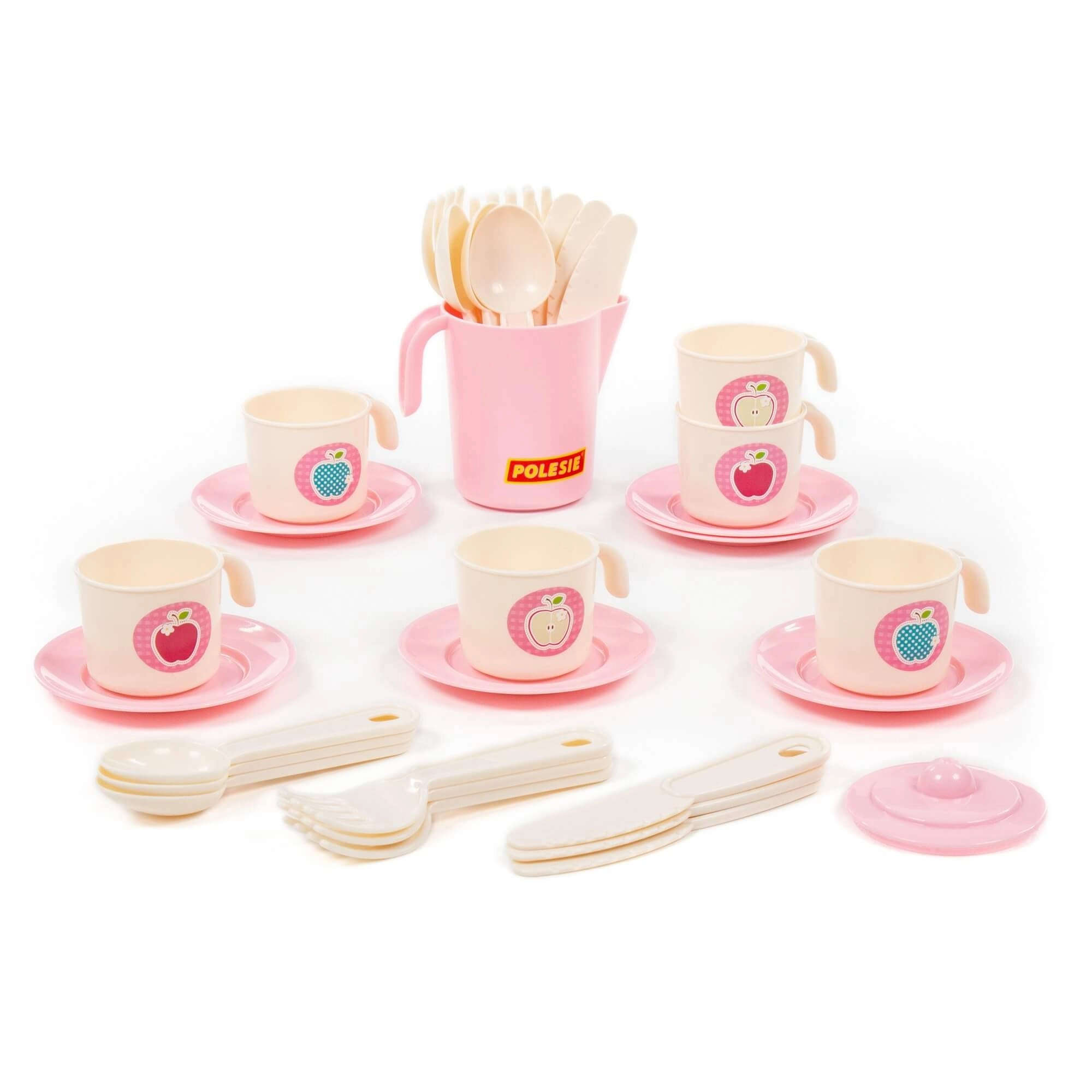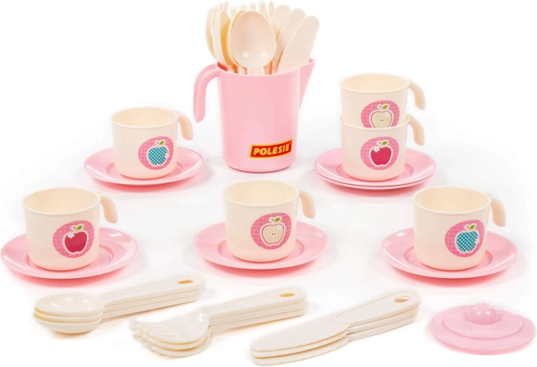 Zestaw 32-elementowy obejmuje filiżanki ze spodkami, talerzyki, sztućce i imbryk – dzieci mają wszystko, czego potrzebują do serwowania napojów i smakołyków.
