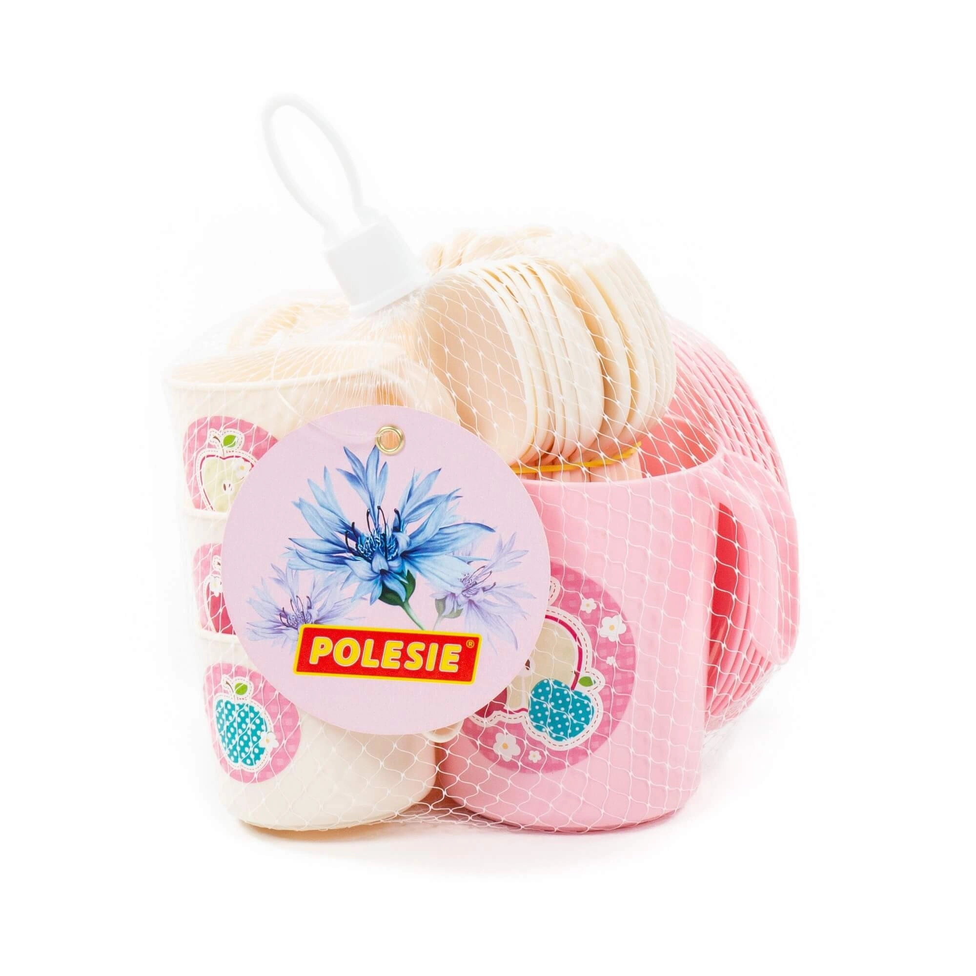 Zestaw zapakowany jest w praktyczną siateczkę z etykietą, dzięki czemu łatwo go przechowywać i przenosić w gości lub na dwór.