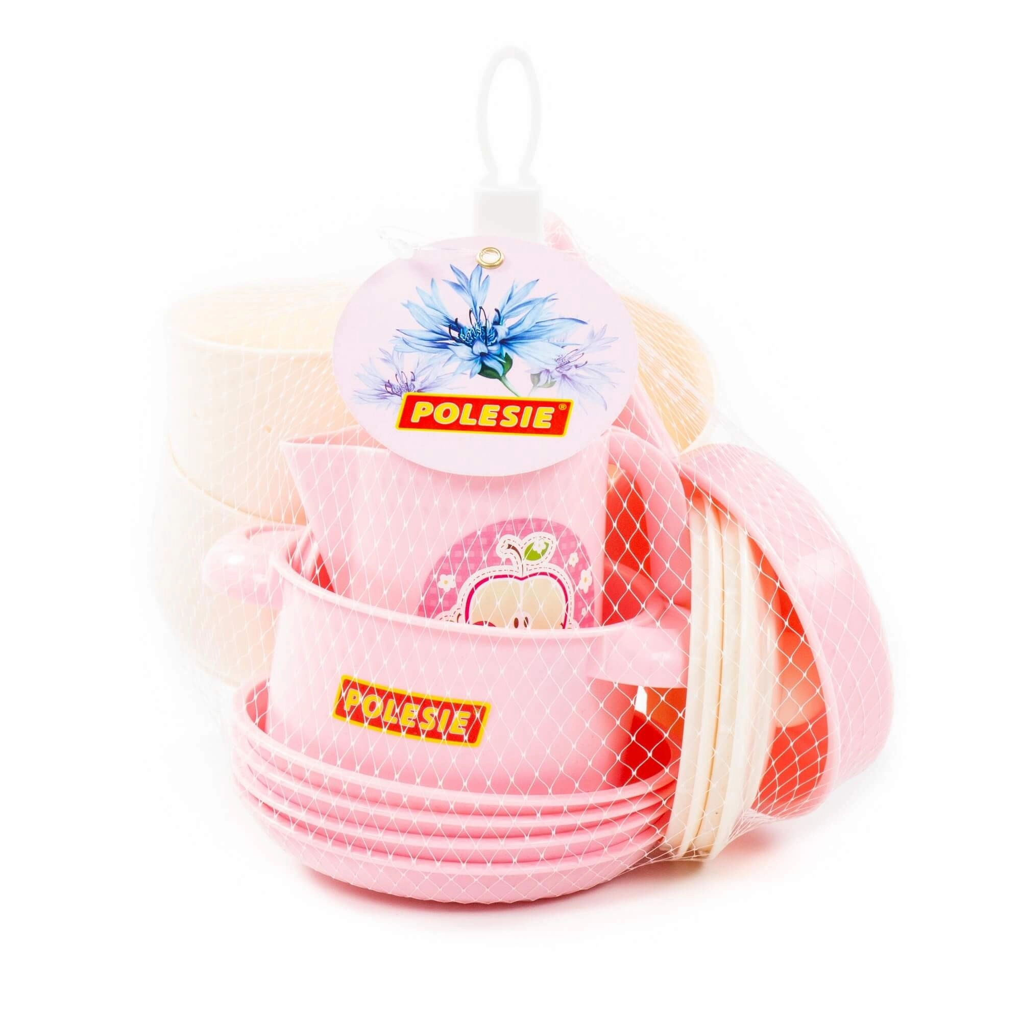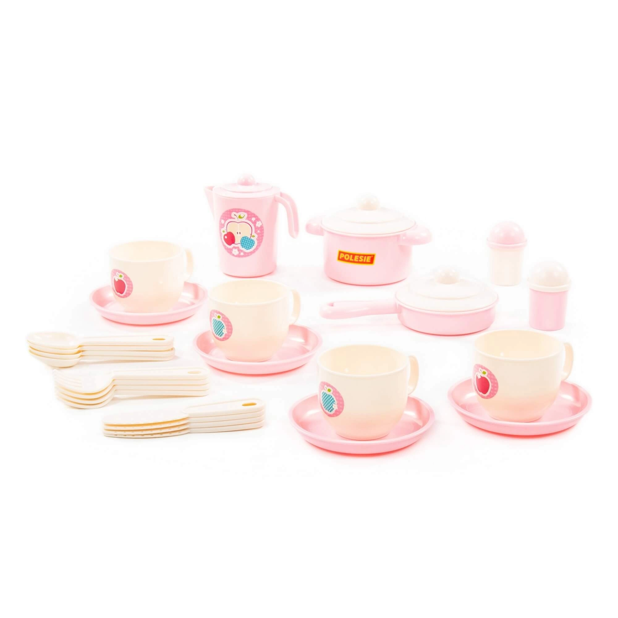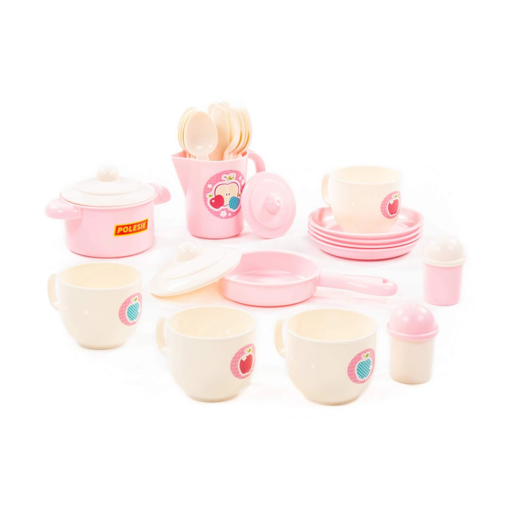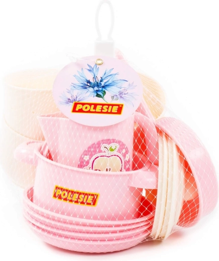 Ten wesoły zestaw w delikatnych pastelowych kolorach zawiera wszystko, co potrzebne do dziecięcej zastawy: filiżanki ze spodkami, talerzyki, garnek z pokrywką, patelnię z pokrywką, dzbanek, chochlę, łyżki i inne akcesoria. Dzięki wytrzymałemu i lekkiemu plastikowi naczynka są łatwe w obsłudze i bezpieczne dla dziecięcych rąk.