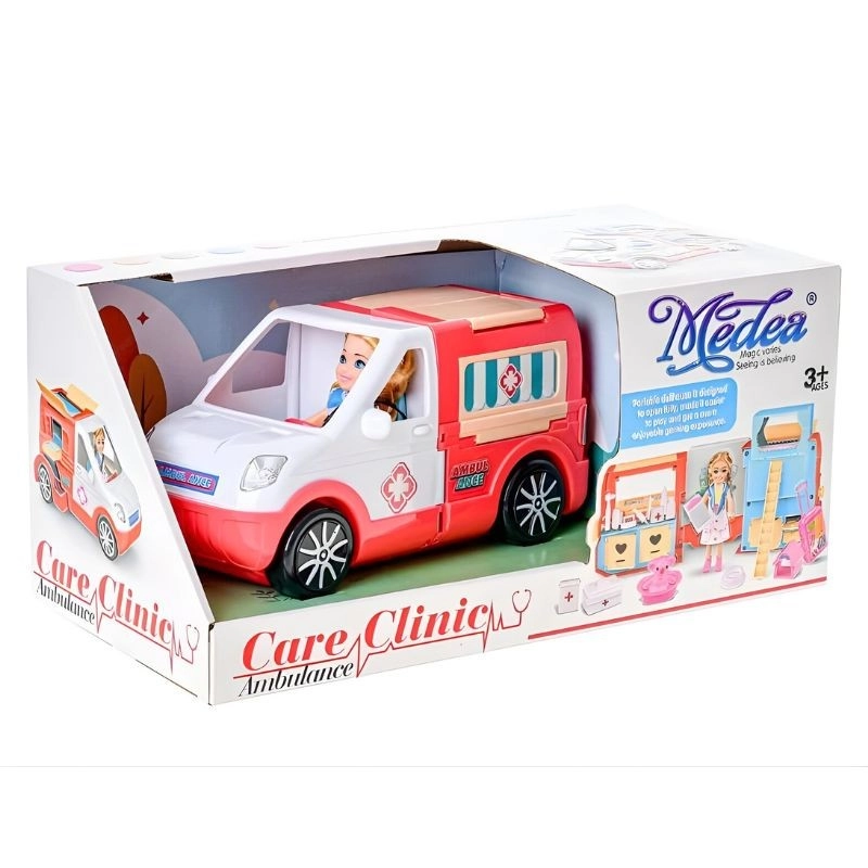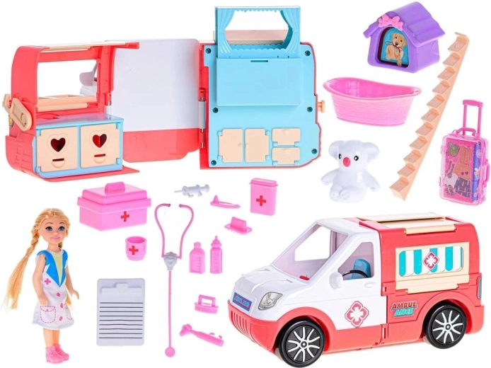 Ta mobilna klinika ucieszy wszystkich małych opiekunów. Dzięki otwieranym drzwiom i przemyślanemu wnętrzu karetka łatwo zmienia się w mobilny gabinet dla ludzi i zwierzątek. Zestaw obejmuje laleczkę – kierowcę karetki, wyposażenie medyczne, kuferek, zwierzątko z transporterem oraz inne dodatki do emocjonujących akcji ratunkowych.