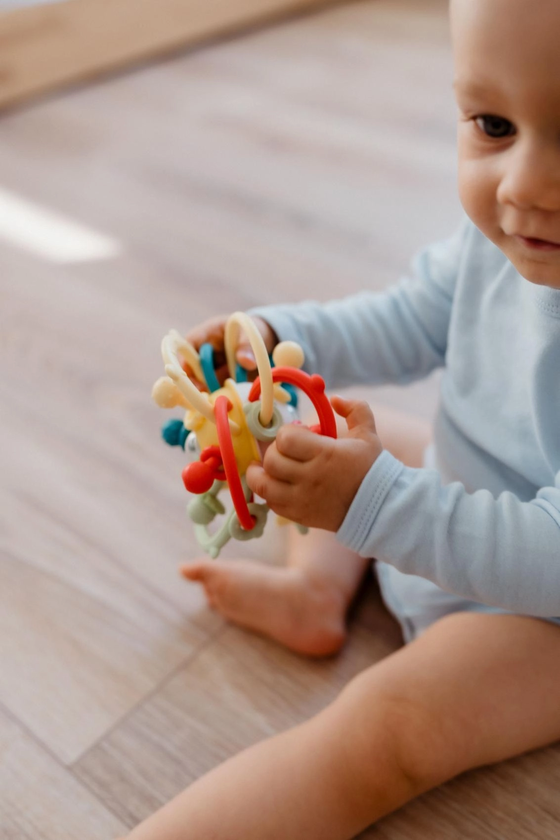 Przezroczysta centralna część z kolorowymi koralikami tworzy delikatny dźwięk, który wspiera percepcję słuchową i motywuje do aktywnego ruchu – potrząsania, przekładania z ręki do ręki i turlania po podłożu. Zabawka została zaprojektowana z myślą o rozwoju małej motoryki, koordynacji oko–ręka i stymulacji sensorycznej od 6 miesięcy.
