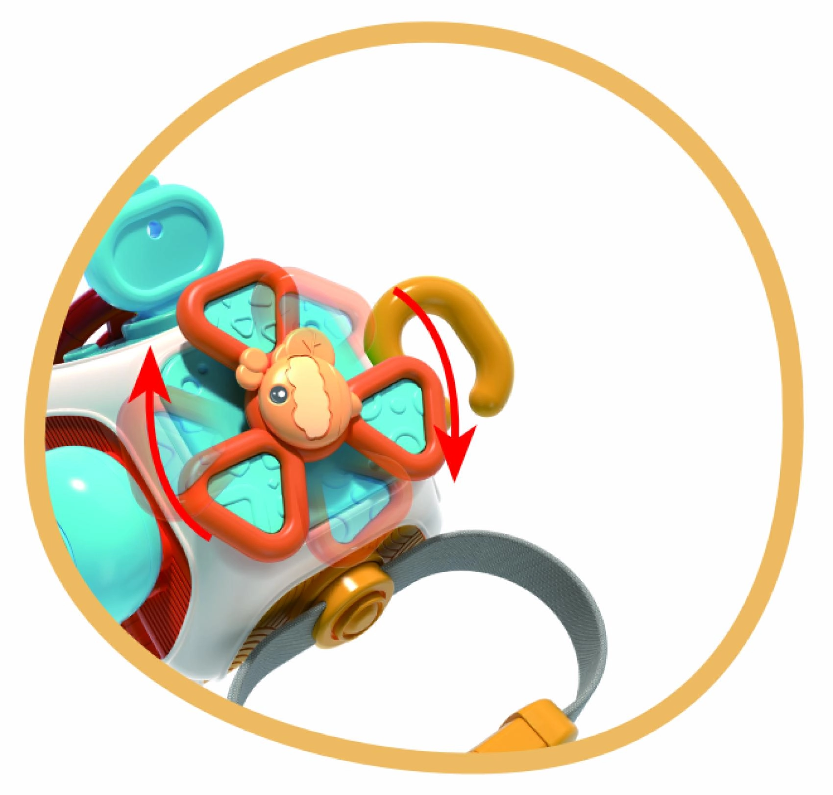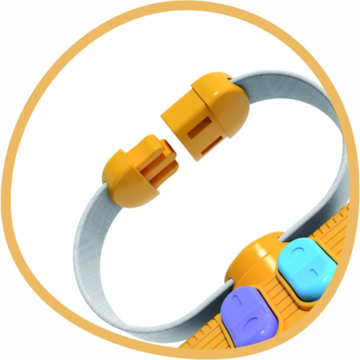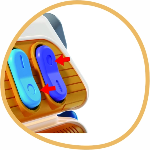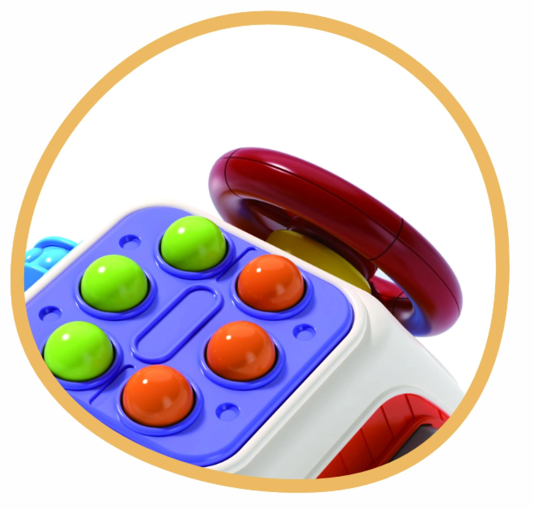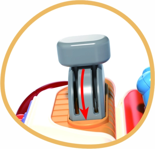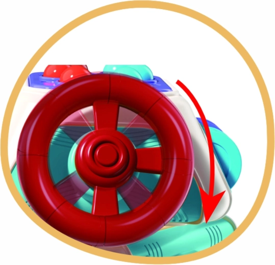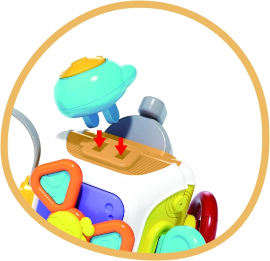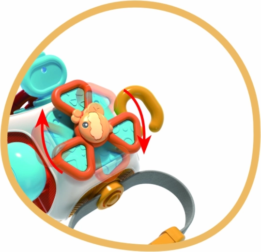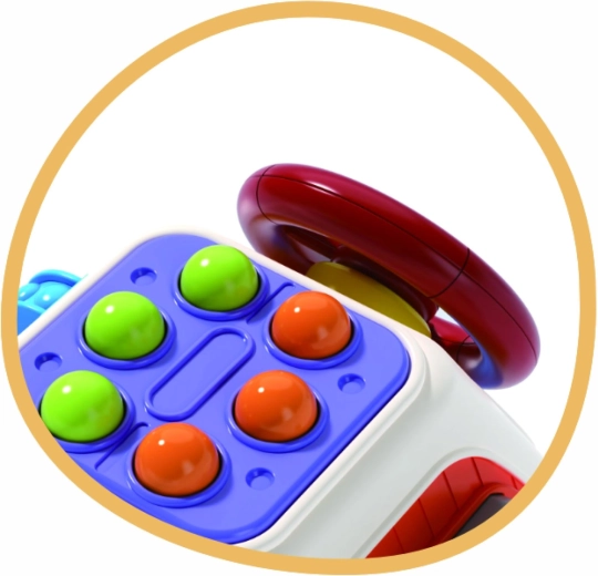 Różne mechaniczne elementy zachęcają do wciskania i przesuwania. Dziecko trenuje paluszki, chwyt oraz rozumienie przyczyny i skutku.