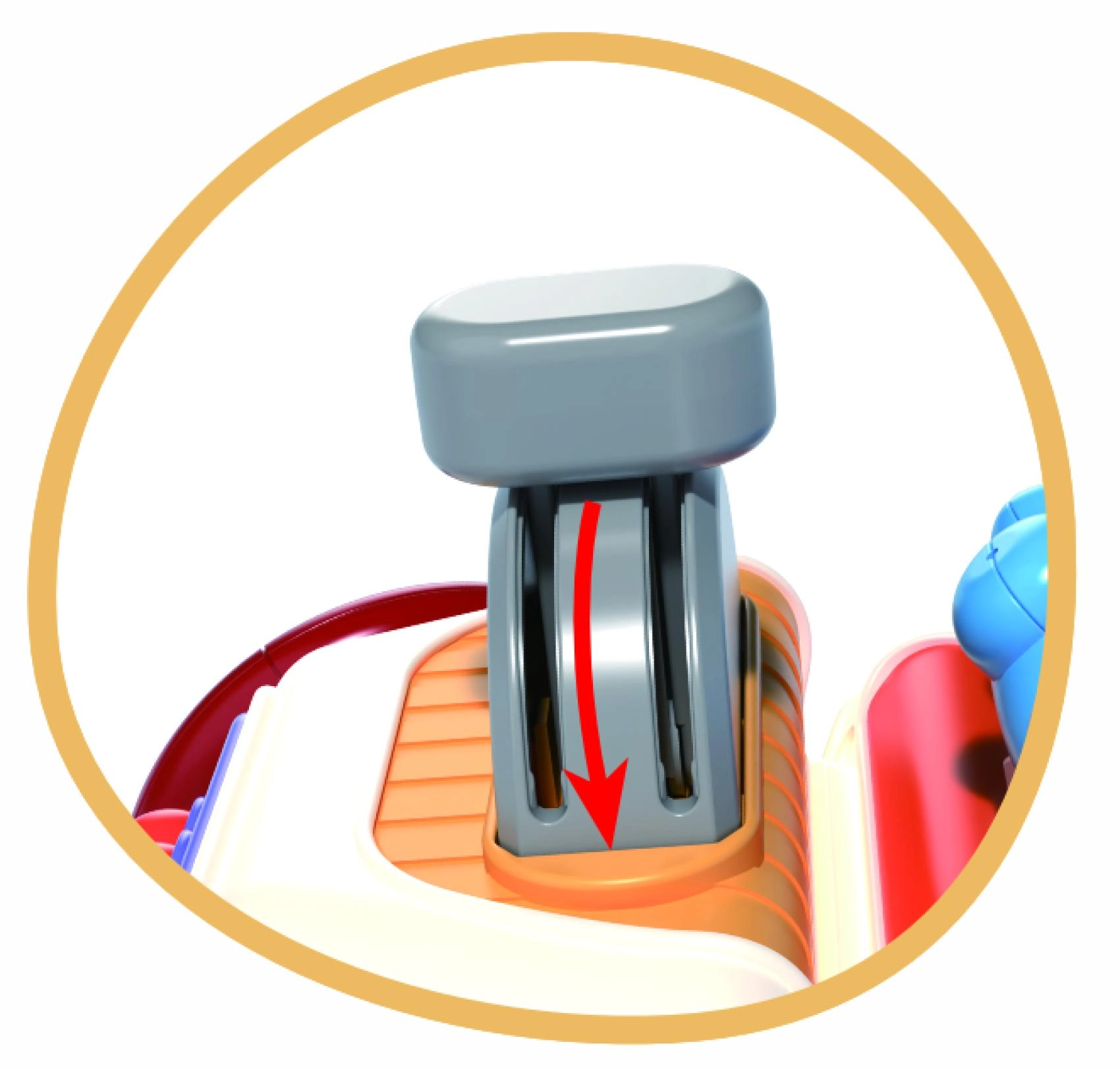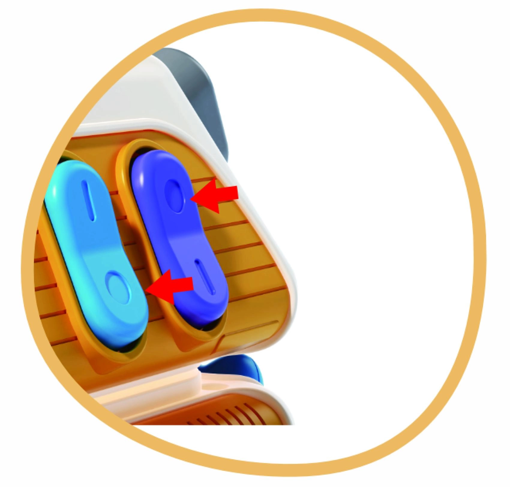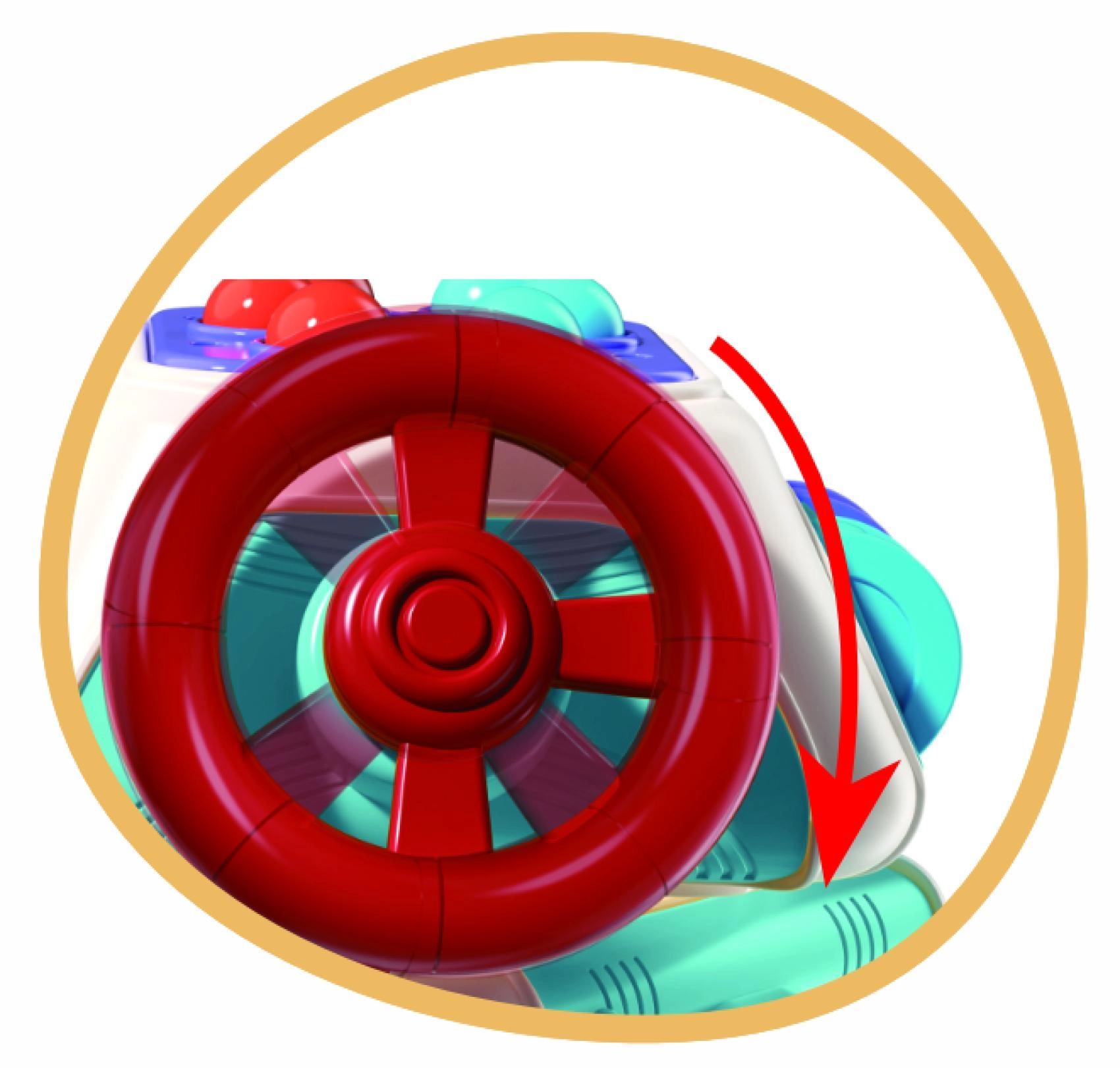 Różne mechaniczne elementy zachęcają do wciskania i przesuwania. Dziecko trenuje paluszki, chwyt oraz rozumienie przyczyny i skutku.