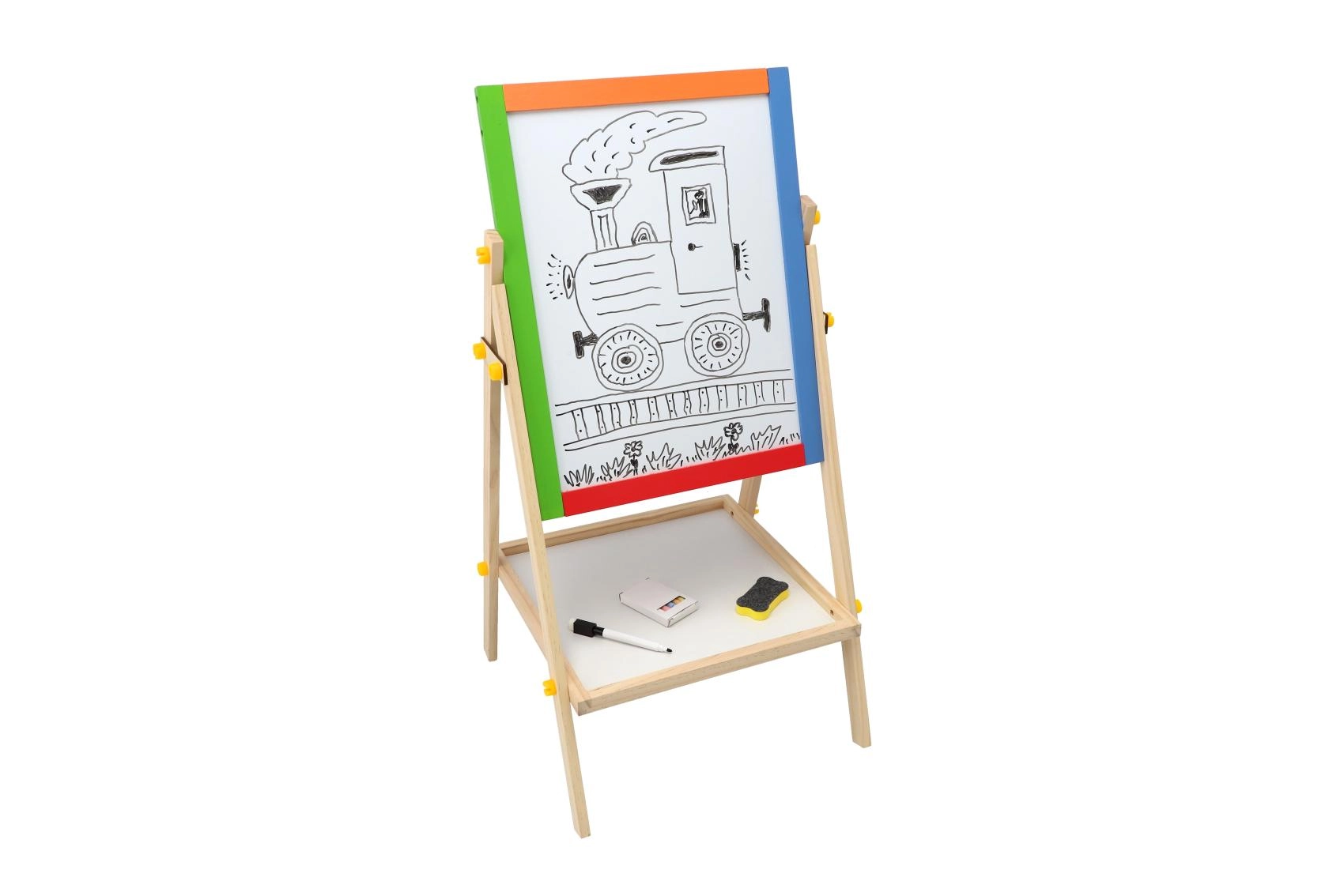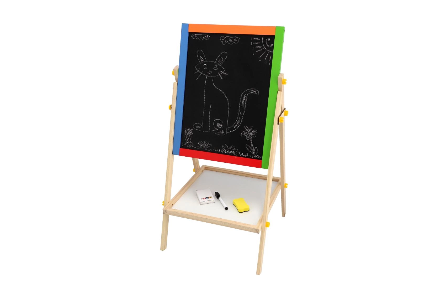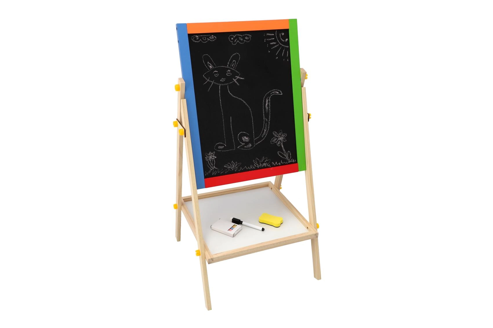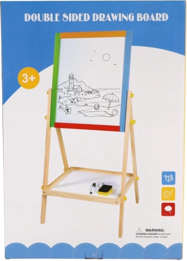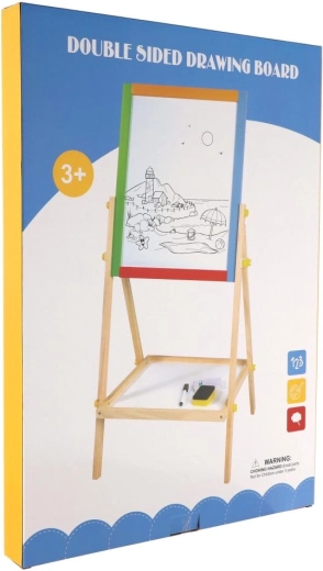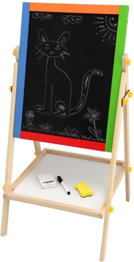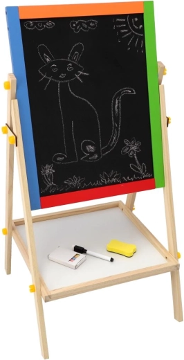 Praktyczna, dwustronna tablica dla dzieci oferuje podwójną zabawę w rysowanie i naukę. Jedna strona jest białą tablicą magnetyczną do markerów i magnesów, druga czarną tablicą kredową do klasycznego rysowania. Stabilna drewniana konstrukcja zapewnia bezpieczne użytkowanie i elegancko wpasuje się w każdy pokój dziecięcy. W zestawie znajdują się praktyczne akcesoria do natychmiastowego użycia.